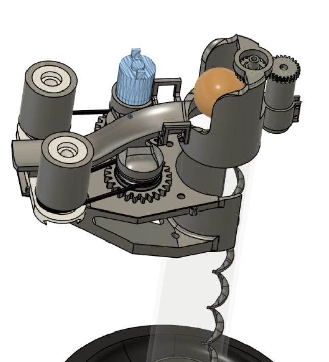 The original plan was to 3D-print the spiral as I’d printed it for the test piece. To maximise stiffness, I printed it at 4 perimeters in PETG. Unfortunately, it was still wayyy too flexy, and the motor could not successfully transfer torque the full way through to transmit balls up.