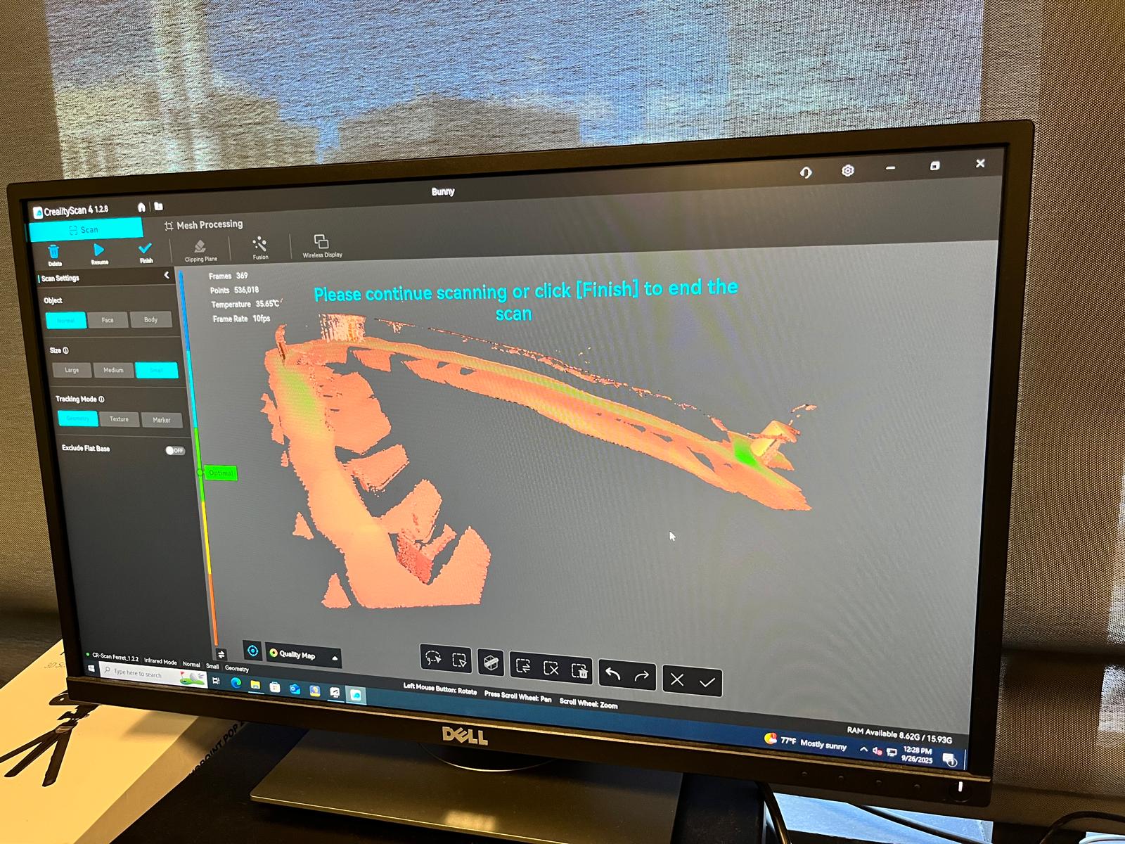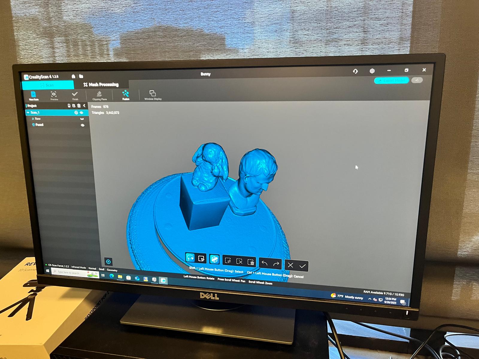 Our scanner was the Creality Ferret Pro. The bunny was placed on a small box atop an automatically-rotating lazy susan. As expected, the first attempt did not go very well, and the software seemed to have difficulty tracking the object.