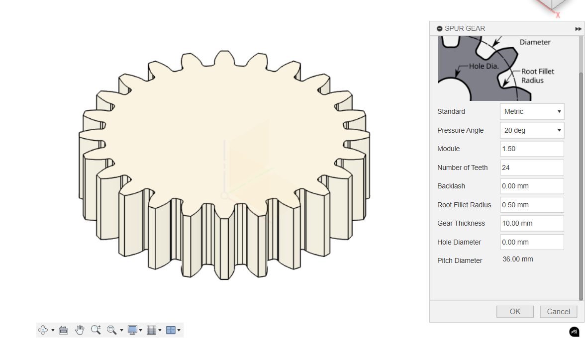 In Fusion, I used to spur gear generation tool to generate the gear, keeping the default settings of a 20 degree contact angle and 24 teeth, but changing the module to 1.5 so that the gear’s meshing diameter (or whatever it’s called) would be 36mm across. I used a root fillet radius of 0.5mm, a gear height of 10mm, and set the hole diameter to 0 - I would be crafting this profile myself.