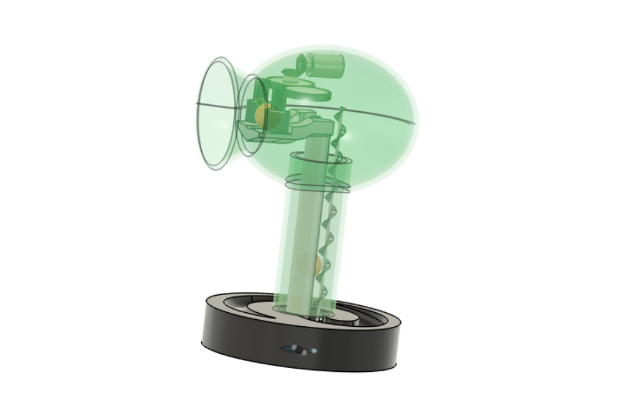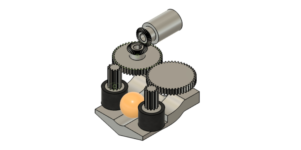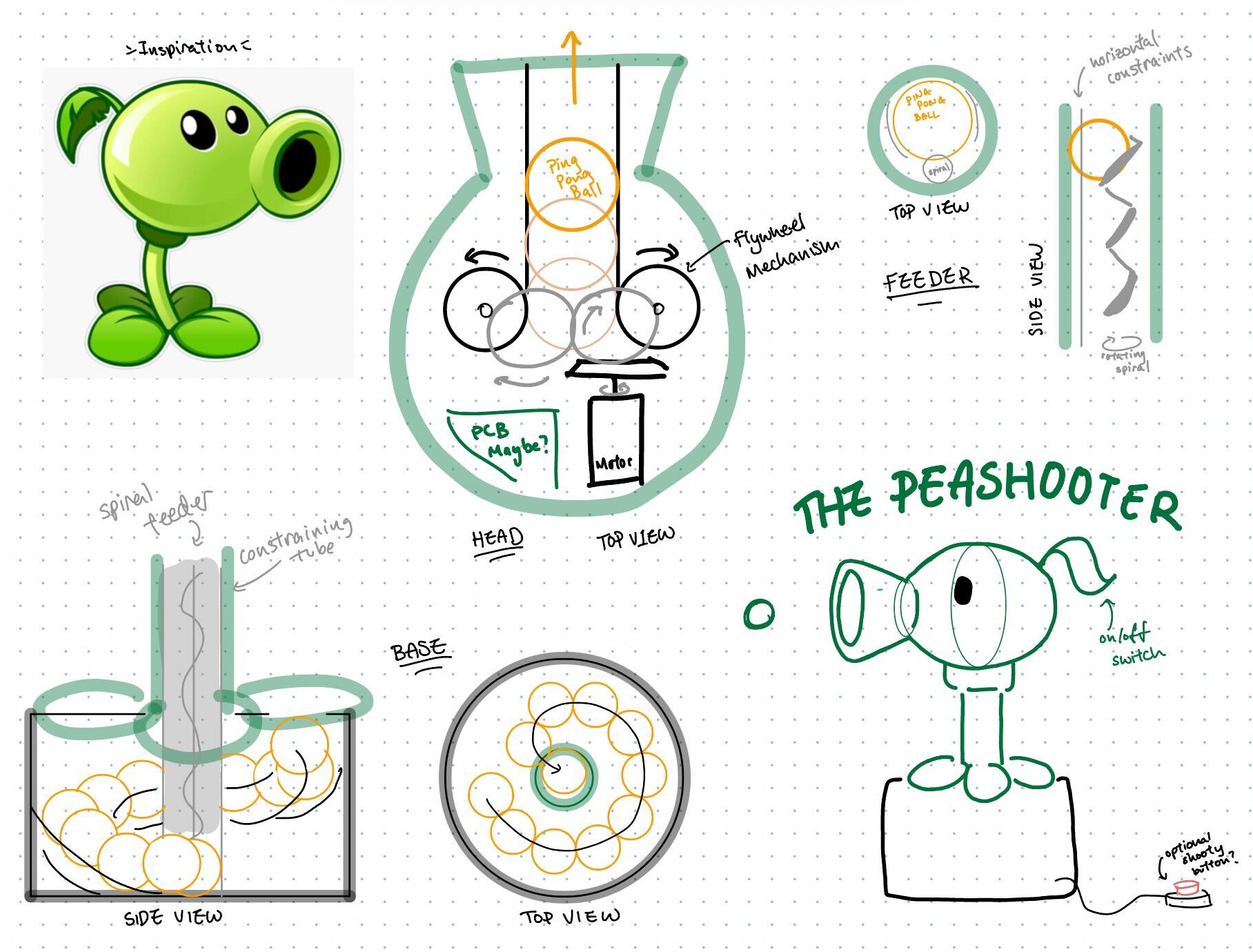 I have very little experience with designing mechanisms, so I tried to stick to things that a) I could intuitively understand, and b) would fit within the form of a peashooter. The shooting part needed to be compact and reloadable, so I settled on a sort of friction-wheel mechanism I’d seen before, and added gears until a motor would fit. The feeder mechanism needed to fit into the stem, so I went with a spiral lift mechanism. The base just needed to feed into the spiral lift, but I didn’t want it to be a point of failure, so I decided on making it a solid, static block with a spiral track that would reliably feed balls into the lift.