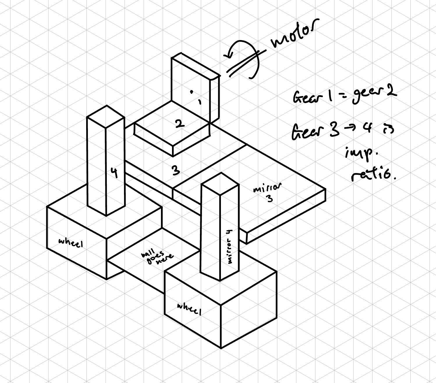 To help design the shooting mechanism, I drew an isometric drawing of the gears - as squares, because circles are hard to figure out in perspective.