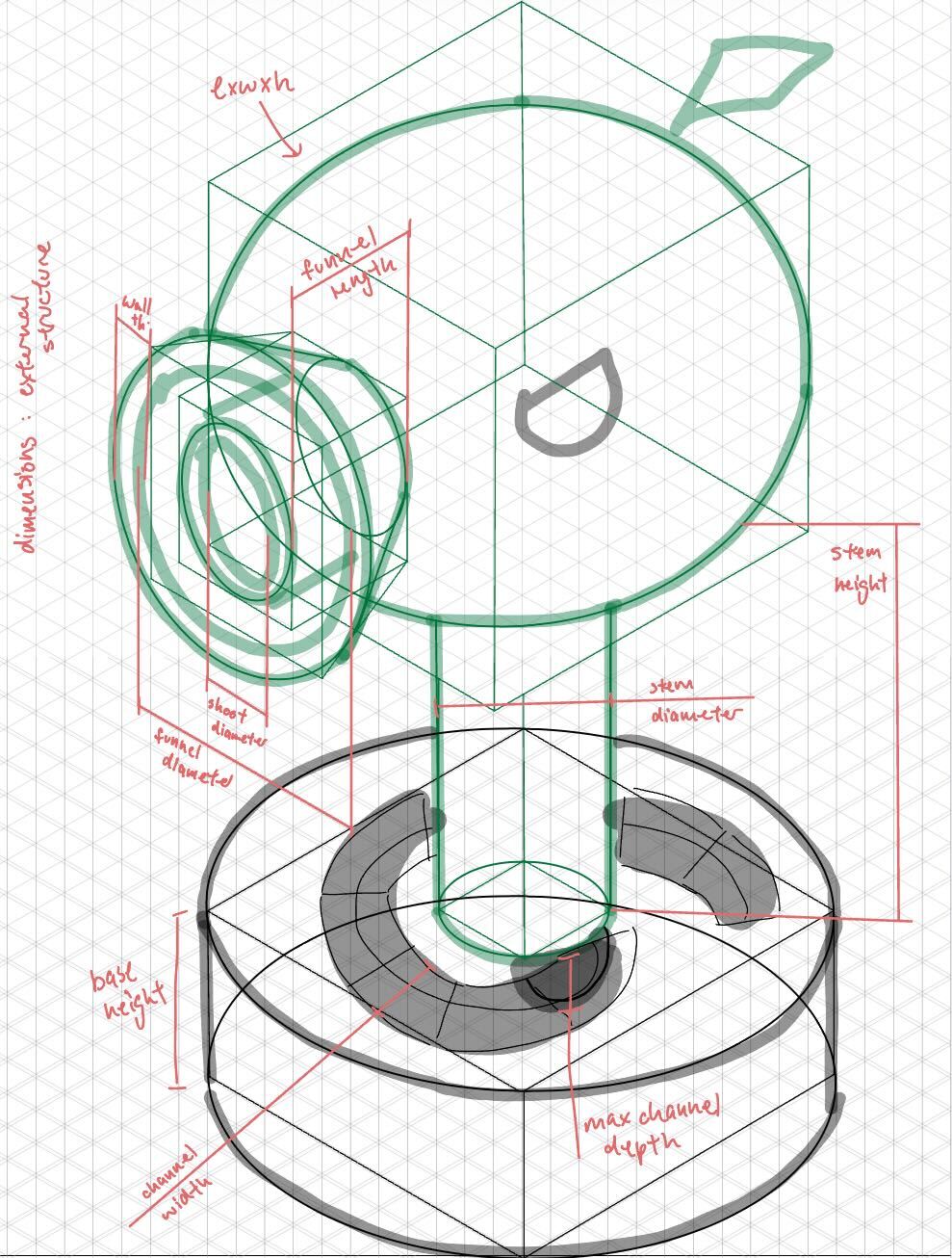 And since I’d found the isometric paper template already, I also drew the full peashooter with some dimensions I thought I might want to consider or paramatrize (spoiler alert: I did not stick to these)