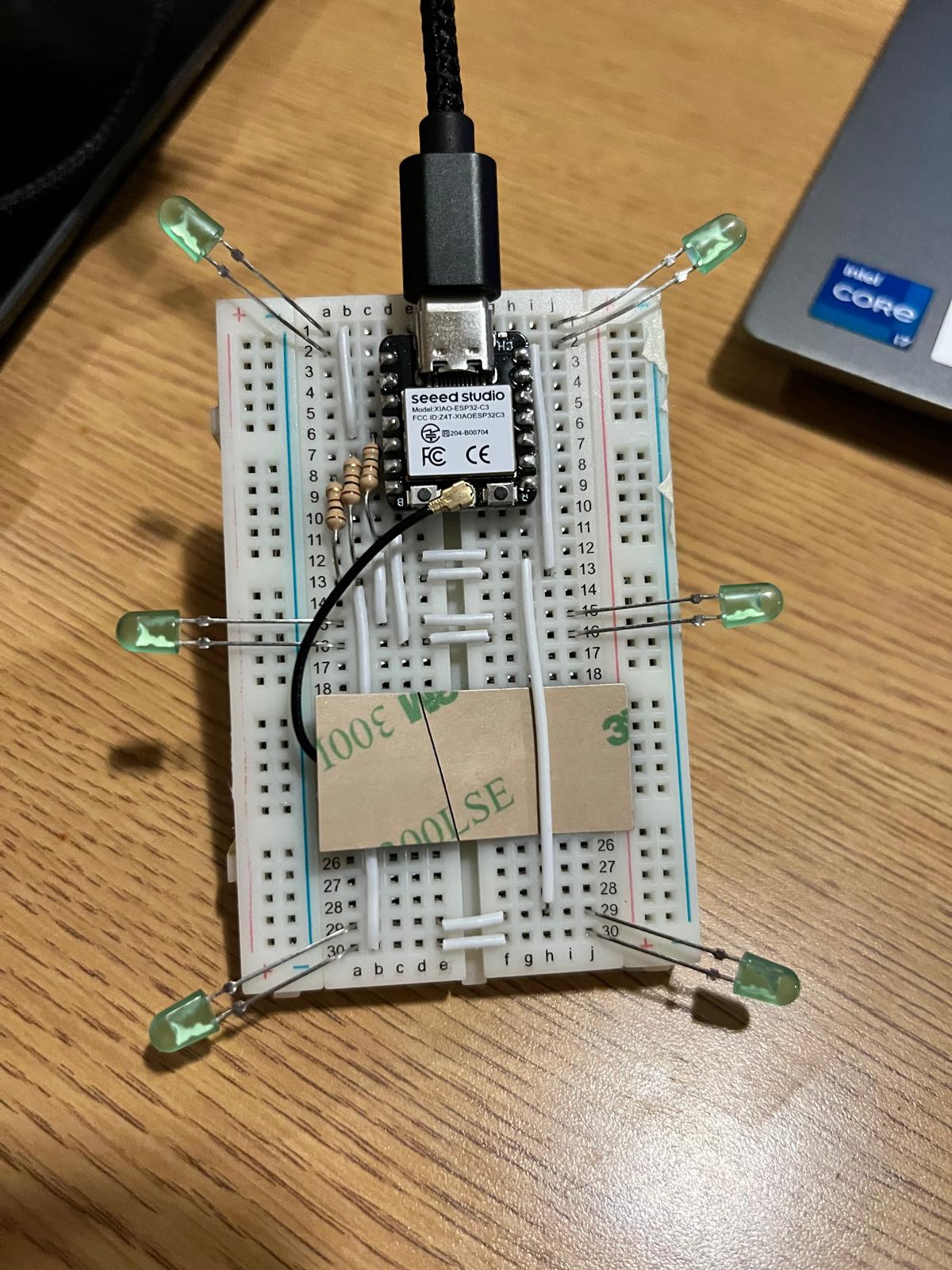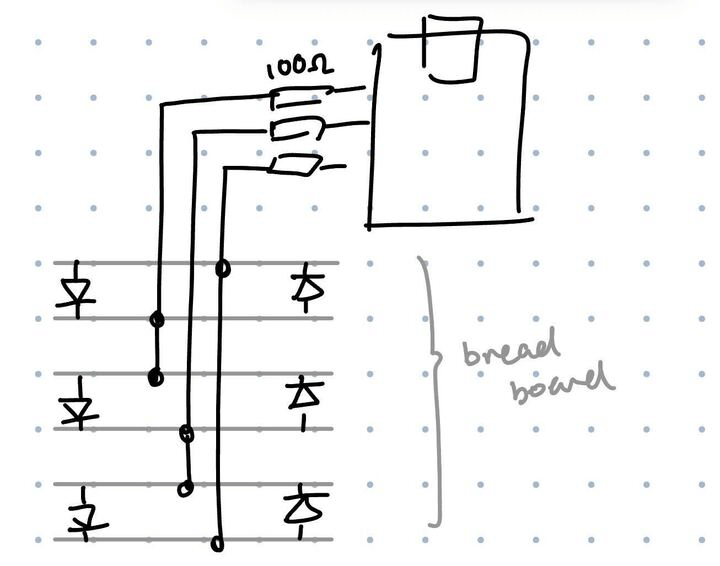 I had a bunch of LEDs I could put in with my breadboard and not much else, so I wanted to make a light-based home device. Since the ESP32 had few pins, I recalled the Charlieplexing talked about during the outputs lecture, and decided to try my hand at it.