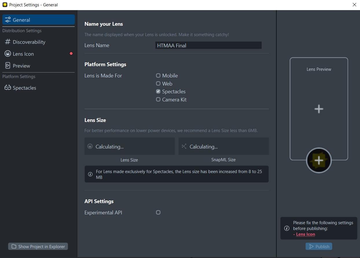 In the project settings, you’ll have to indicate that you’re building a Spectacles app: