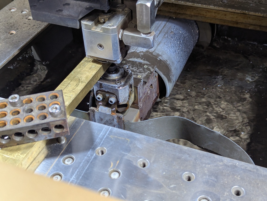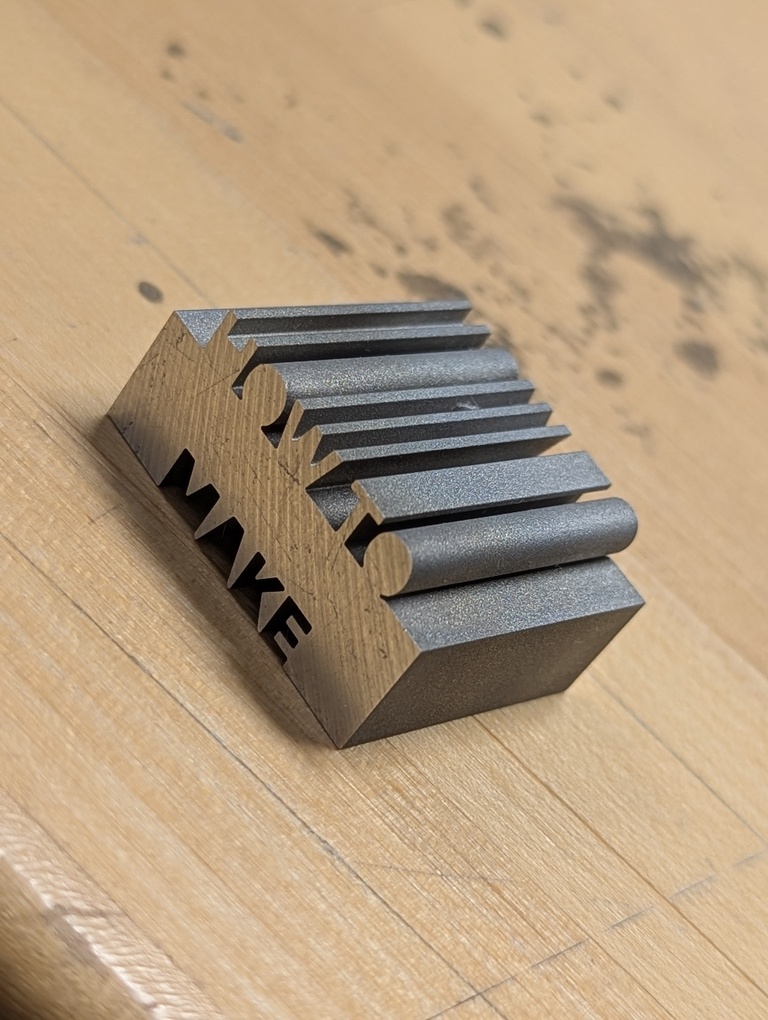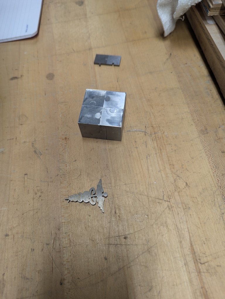 This new cut finishes successfully! All in all, the process took about 5h. The cut for the eventual final piece took 40min. The final piece can be seen below. I’m quite happy with it. We might try to run the job using the brass stock again. Anthony confirmed that rubbing off the oxidization layer improved the cutting speed significantly.