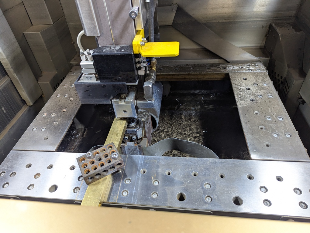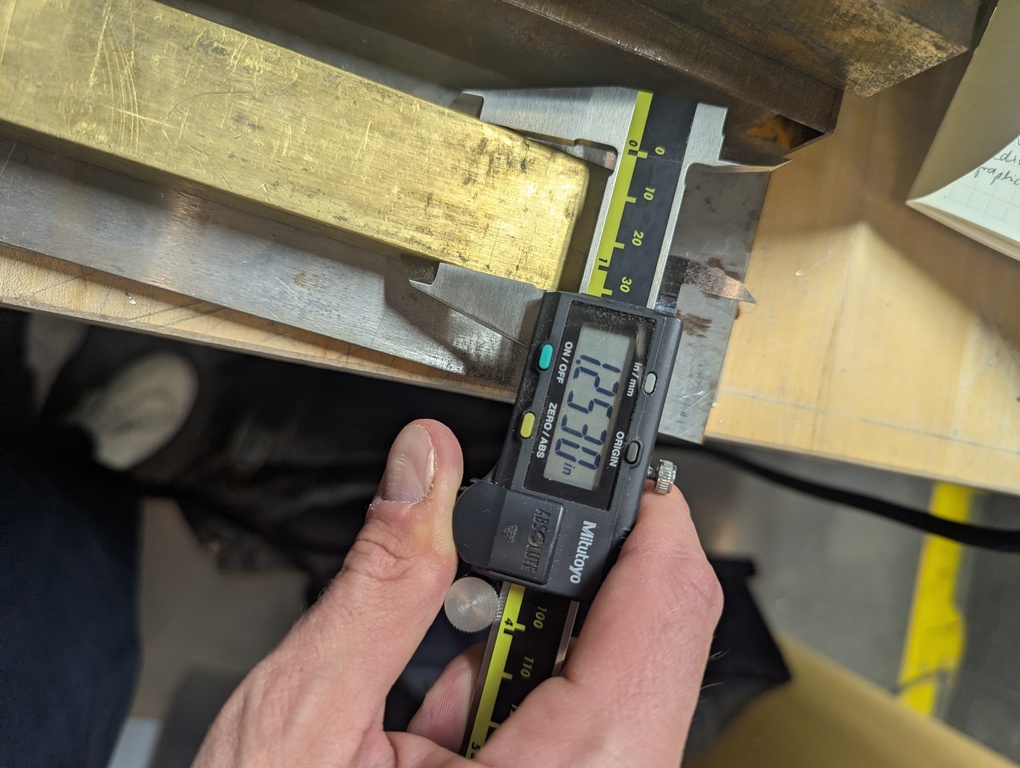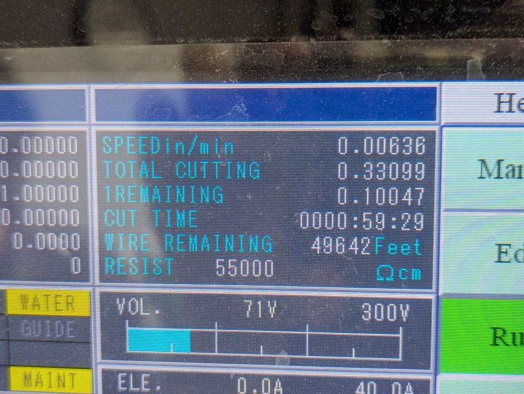 We notice that the cut takes a long time. After 1h, we had a 0.3in cut. That’s not gonna cut it (pun intended). We hypothesize that it’s something about the brass that makes the machine unhappy, potentially the oxidization on it. We switch to the aluminum stock that other people had more success with the day before. Pictures below show cutting speed before and after the switch. The aluminum makes for a much faster cut.