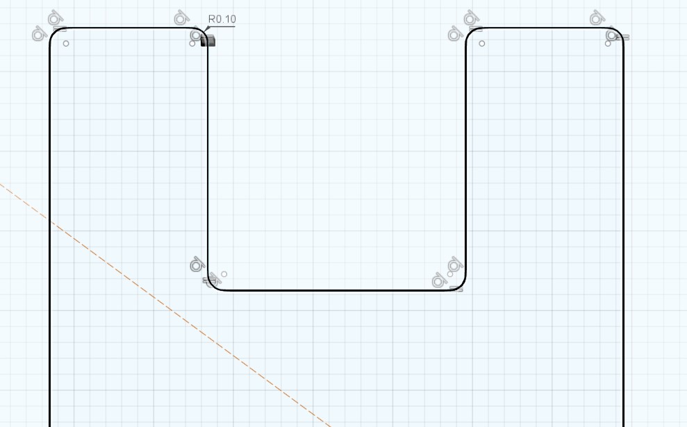 Some corners are very easy to equip with a fillet. Anything that’s a 90 degree angle in my design just consists of 2 lines that meet in a point. Adding a fillet to that point does the trick. I do that everywhere in the design. Example: