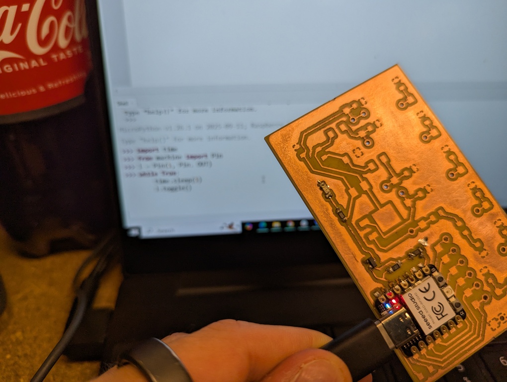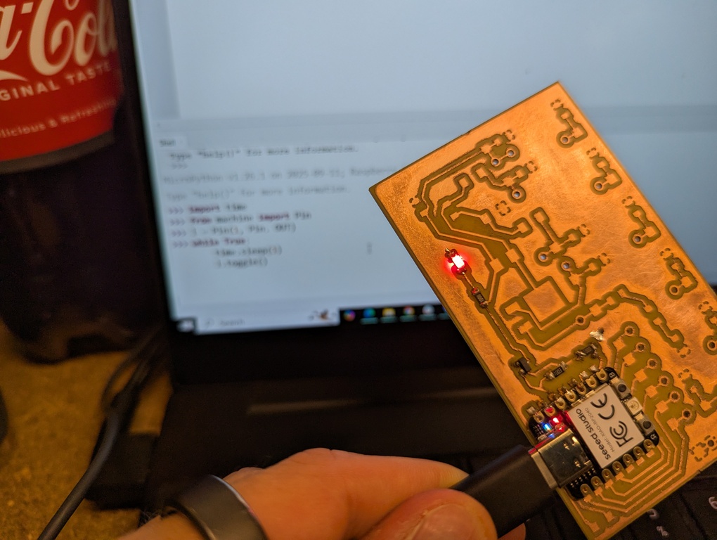 I fixed the problem with the missing ground plane connection as well, and after fabrication soldered the LED sub-circuit onto the board. The below images show the blinking LED.