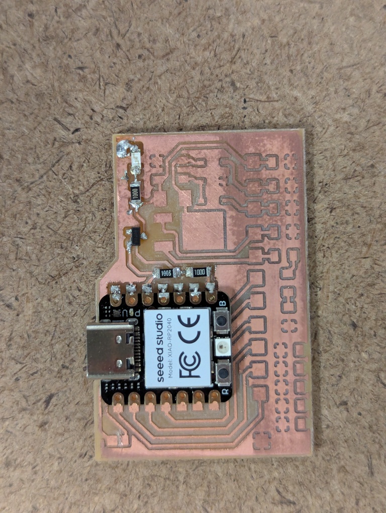 I had made/modified 2 footprints for this board. For the Xiao footprint, I removed all the holes which was easy enough and successful. I also added a custom footprint that was intended to allow me to connect a battery to the board. I didn’t get around to testing the battery this week, but when I first made the board I noticed that the 2 pads I added to the footprint weren’t separated correctly. Clearly, I didn’t add enough clearance between the pads. Separating them with a box cutter was easy enough, though.