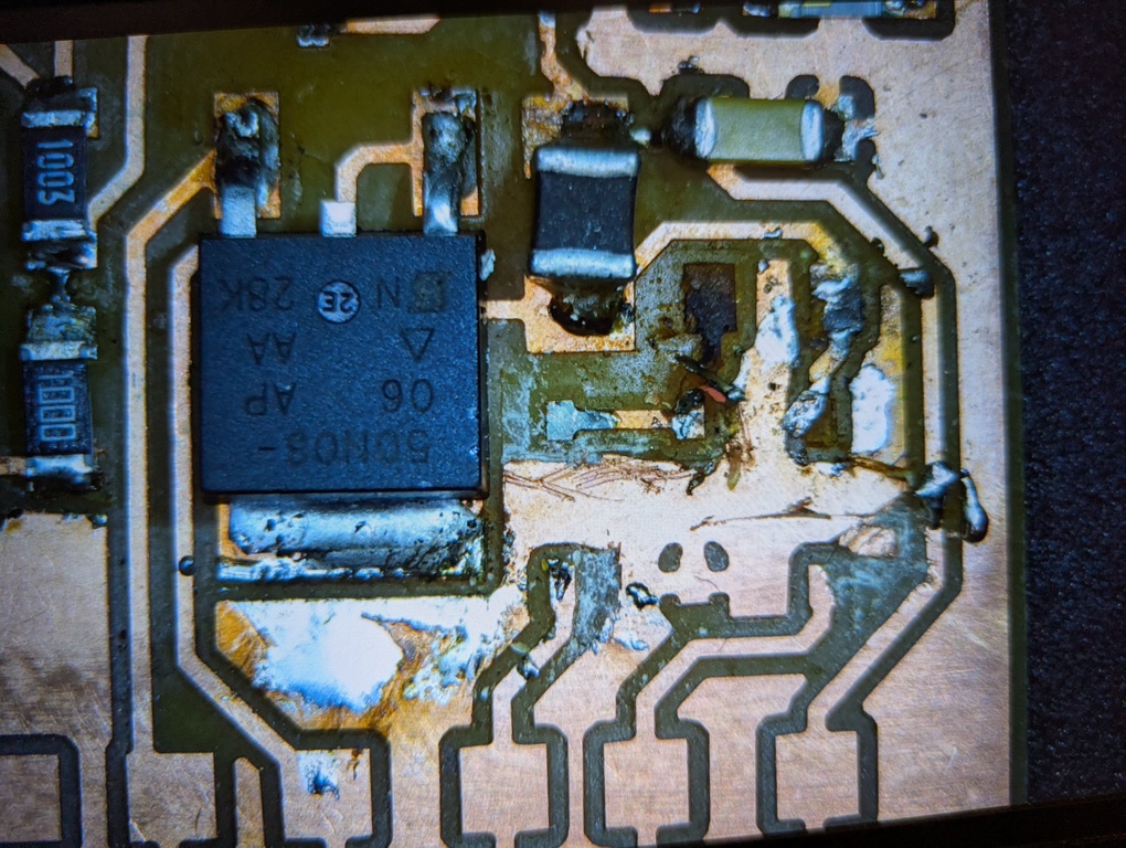 I then proceeded to soldering all additional components onto the board - I tried at least. I was a little too optimistic in my design and overestimated my ability to solder small components that are placed very close to each other. I used the minimum clearance of 0.4mm for all traces as well which caused some additional struggling. To top it all off, I noticed that the footprints I used for the 3 diodes in my design were sub-optimal. The pads were very small and the diodes large enough to touch the ground plane surrounding the diode pads when soldered on. I tried to manually add more clearance to those pads by scratching copper off of the ground plane, but it didn’t work very well. I actually messed up my board quite a bit in the process. Copper traces came off, when trying to solder to the diode pads and some parts of the board ended up quite charred.
