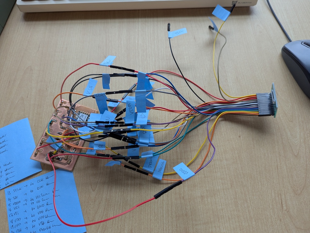 I then proceeded to solder all remaining components onto the board which worked much better this time. The larger clearance between traces and ground plane helped a lot, and I had gotten better at soldering, as well. I was quite happy with how the sodering went on this new board. During the re-design stages I had also added additional pads and holes for headers so I could try to connect the board to the commercial breakout board I bought for connecting to the e-ink display.