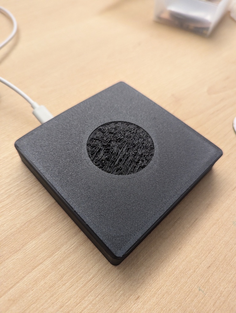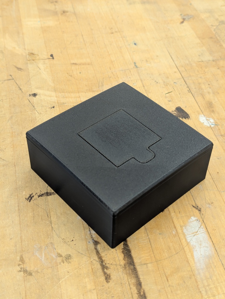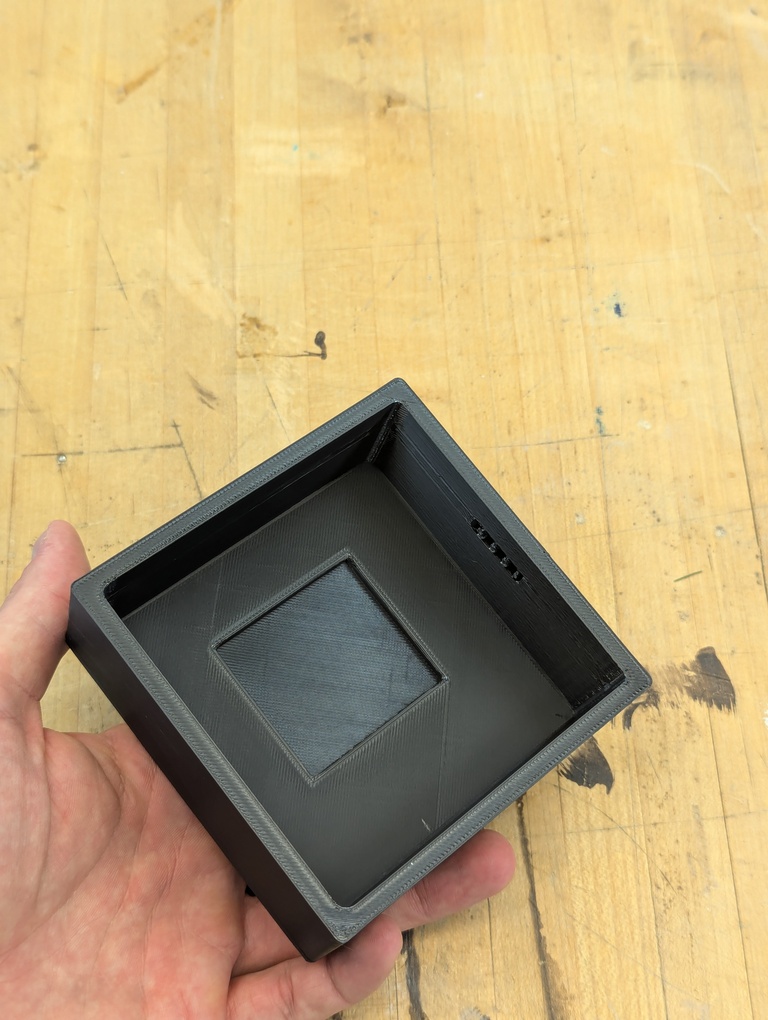 I didn’t have any trouble with the circuit board this week. I also printed a case, though, and it took me 3 attempts to get somewhere that worked reasonably well. I wanted to have an indented area in the top that would make it obvious where to place the physical albums. The albums will be made from cardboard on the laser cutter. My first attempt at the case had an indentation that wasn’t deep enough. The plastic must’ve sagged enough to essentially make a completely flat surface. Pictures below. It shows the shape of the entended indented area, but it just wasn’t successful.