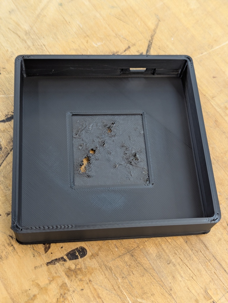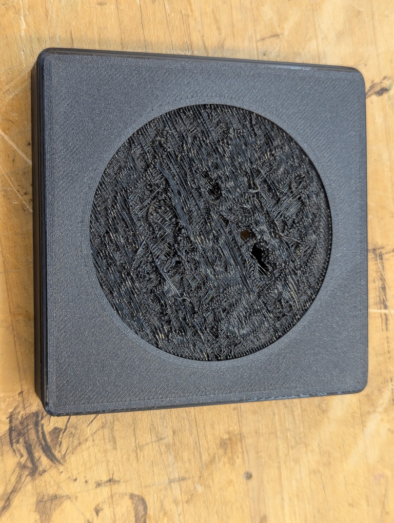 Sun suggested that I use round cardboard cutouts to represent CDs or vinyl which made a lot of sense to me. So, the next iteration of the case uses a round indentation at the top. I tried to print this case upside down with no support, - relying on the fact that bridging between two areas should theoretically work. Unfortunately, the plastic sagged so much this time that it created holes. See below.