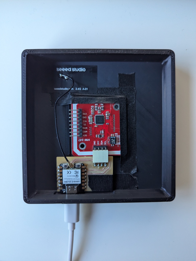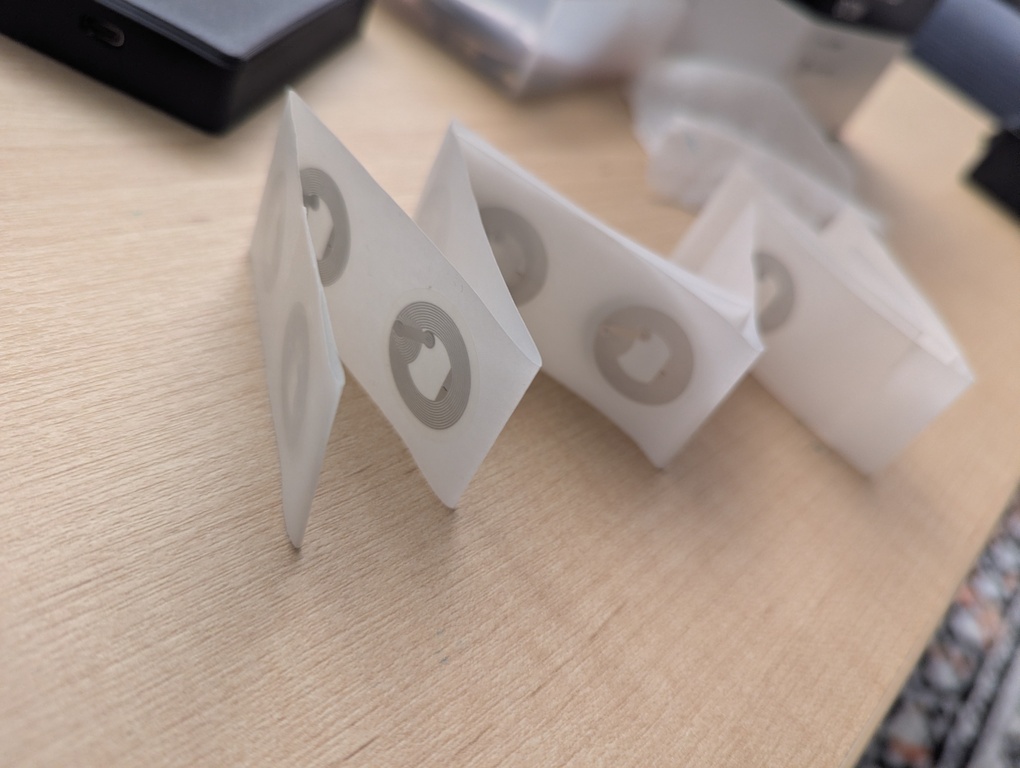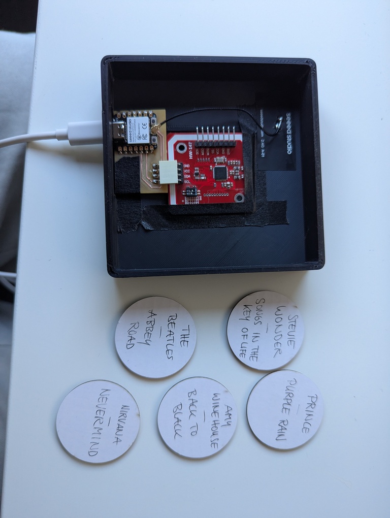 NFC is a fun technology. In this week’s assignment I use it to identify a physical representation of an album on Spotify. The input device I’ll be using is an NP532 IC which can read NFC tags. It communicates via I2C with an ESP32-C3. For the NFC tags themselves I use little stickers that can be added to essentially anything. They’re super thin and cheap.