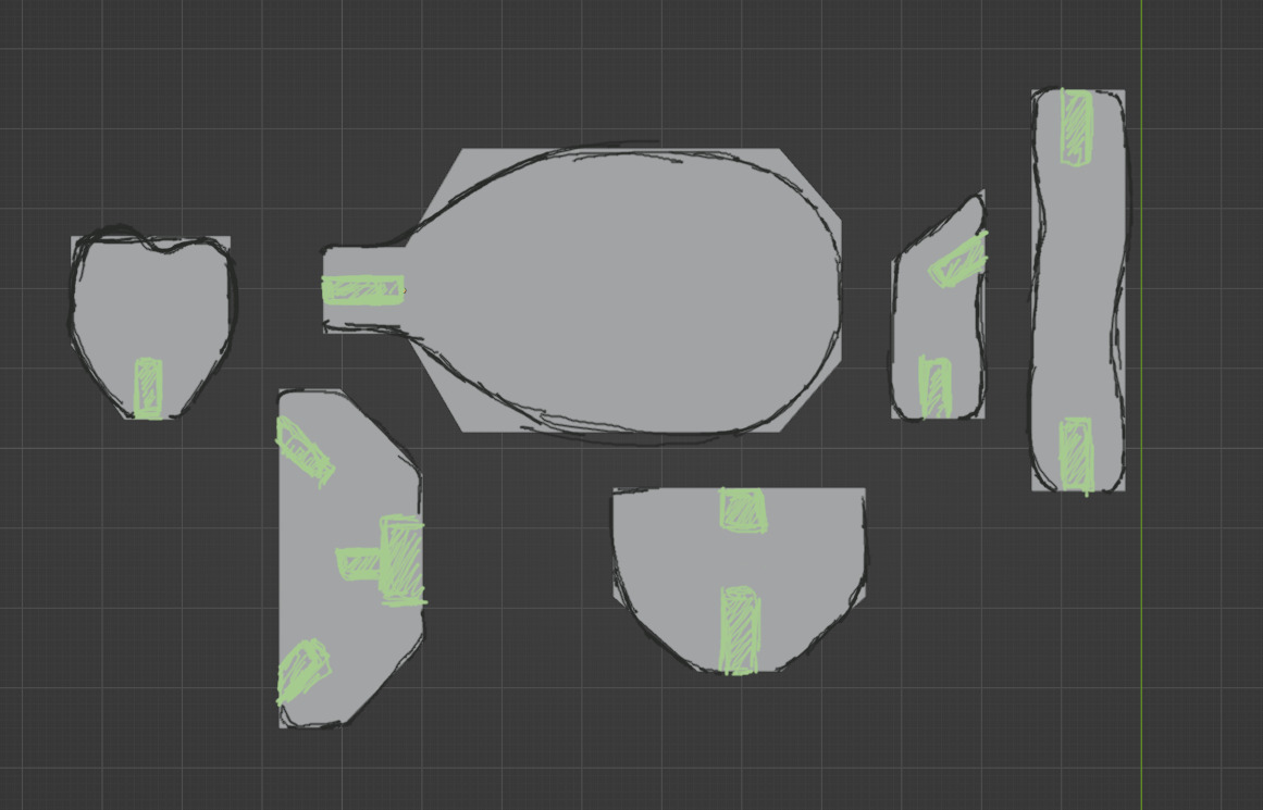 I then flattened the pieces in Blender by making copies of each unique item, rotating them into the X|Z plane and rendering an orthographic image from the top. The resulting image was a good starting point for sketching in GIMP to determine the actual shapes I was hoping for. At this step I hoped to break up the straight lines, create a more organic look, and also indicate where the parametrized joints needed to be.