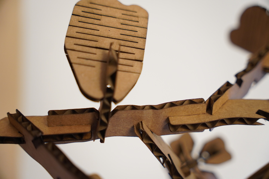 I also started playing with living hinges to see if I could make the leaves bend. I would rate the result a 5/10. They clearly have the potential to bend, but I think I’d need to put weights on the tips of the leaves to force them into the shape I had envisioned. I tried orienting the cuts for the living hinge both perpendicular and parallel to the corrugation. The version with perpendicular cuts turned out better in terms of structural integrity, - so that’s the final design I went with.