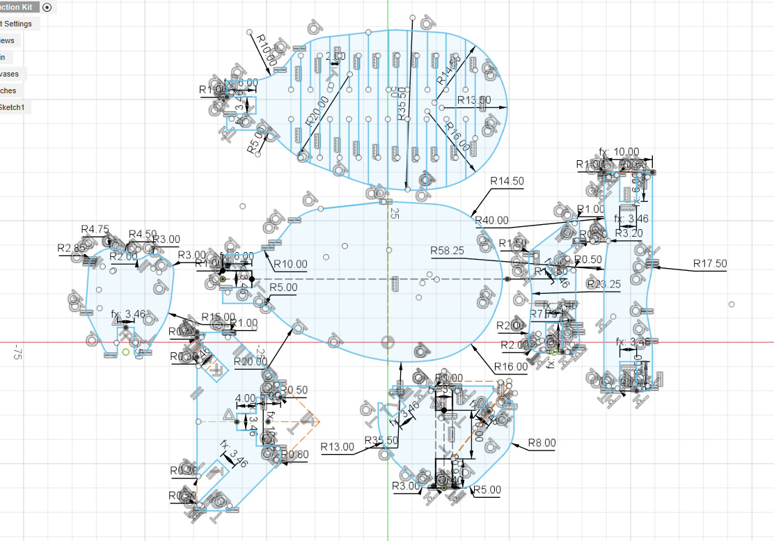 After bringing this sketch into Fusion as a reference, I tried to figure out the physical dimensions that my plants should have. This was a step that I got wrong. Being unfamiliar with the cardboard material (and the frequency of the corrugation in particular), I based my estimate more on aestetics and ignored feasibility. We will come back to this. With my (unfortunate) measurements, I proceeeded to create the sketch. As can be seen in the following pictures, using fillets to create organic shapes became a cluttered affair pretty quickly. I will need to learn if and how I can use proper Bezier style curves in Fusion.