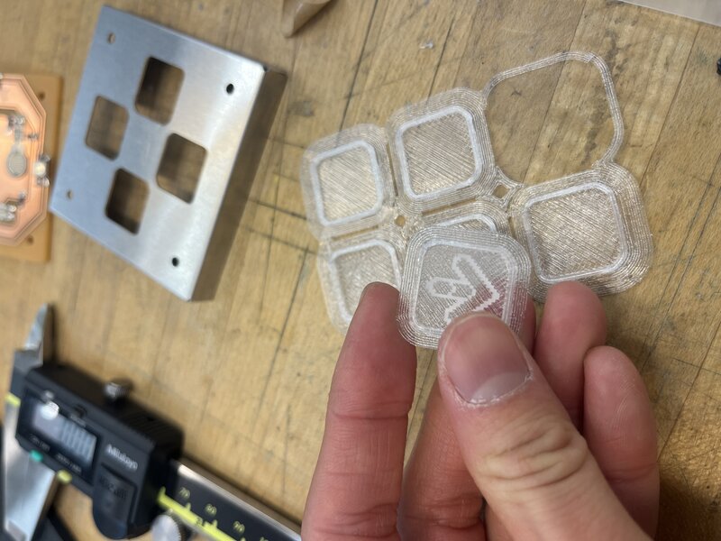Matti helped me laser cut some arrow keys from clear acrylic. I designed a printed a little cup for them to sit in, so they wouldn’t fall out of the DDR board if it were to be inverted (.3mf here):