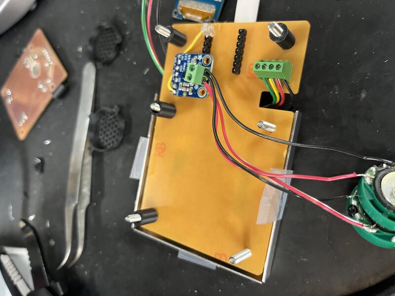 - system integration and packaging: Designed all of the packaging in Fusion360 around the dimensions of the assembled PCB (including, for example, vertical clearance for the screw terminals on the bottom of the board). Designed the PCB with a notch for wire management and strain relieved wires with heat shrink and hot glue. Made sure board and OLED had screw holes which allowed for secure mounting into the final housing.