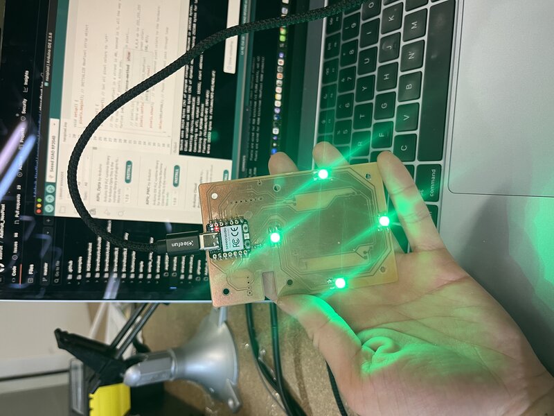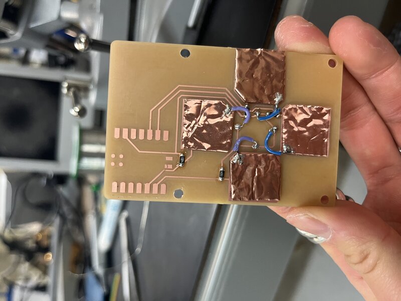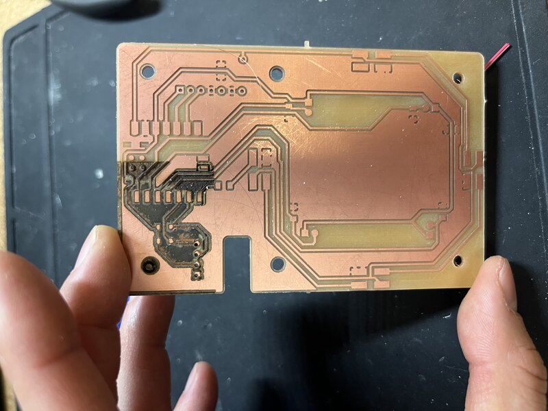I tried again to mill the board and somehow an entire corner was left unmilled. Alan very kindly helped fix it using the laser, but by that time I had already re-milled a third, successful board. But this board looks pretty sick, and surprisingly is connected in all the right places: