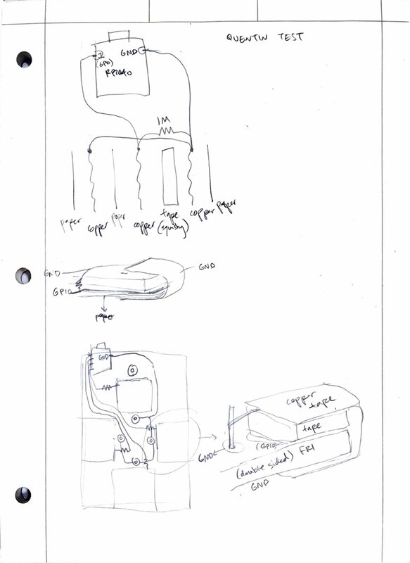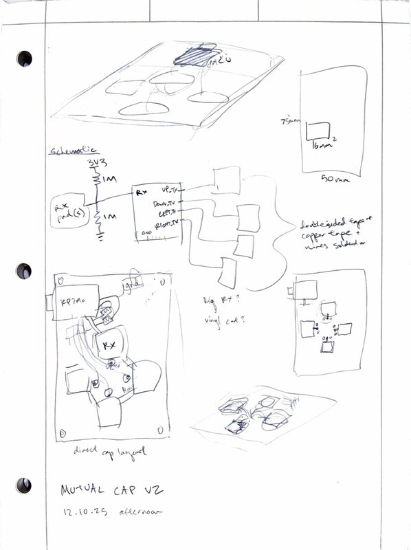 Quentin and I did an experiment to see if we could quickly prototype a mutual capacitance system where the ground plane wraps (like a taco) around the receiver plane which is connected to the GPIO. we were able to get it working, with double sided VHB tape as the substrate between pads: