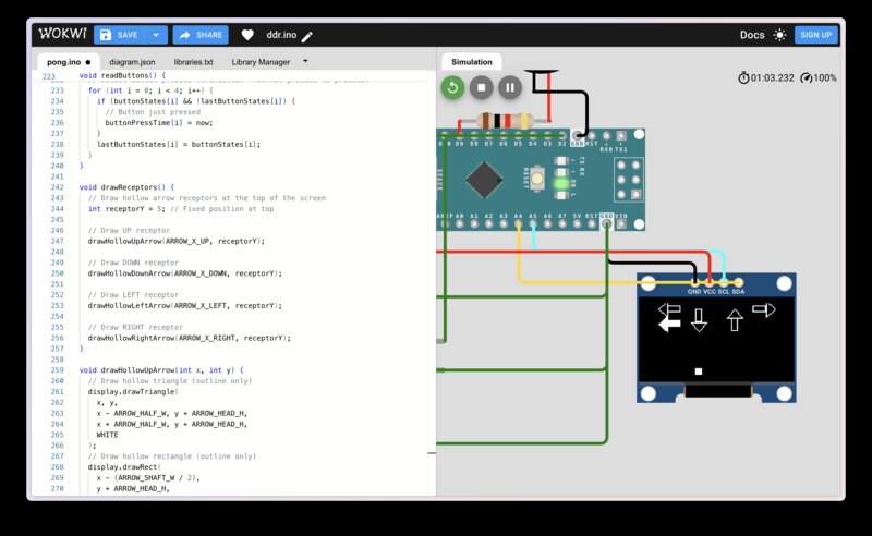 For my Week 3 individual project I used the QPAD to prototype a very barebones version of the code for this project, where arrows are randomly generated below the screen and float upwards across the display. I loaded this onto the QPAD and implemented some simple visual feedback for the directional touch button presses.