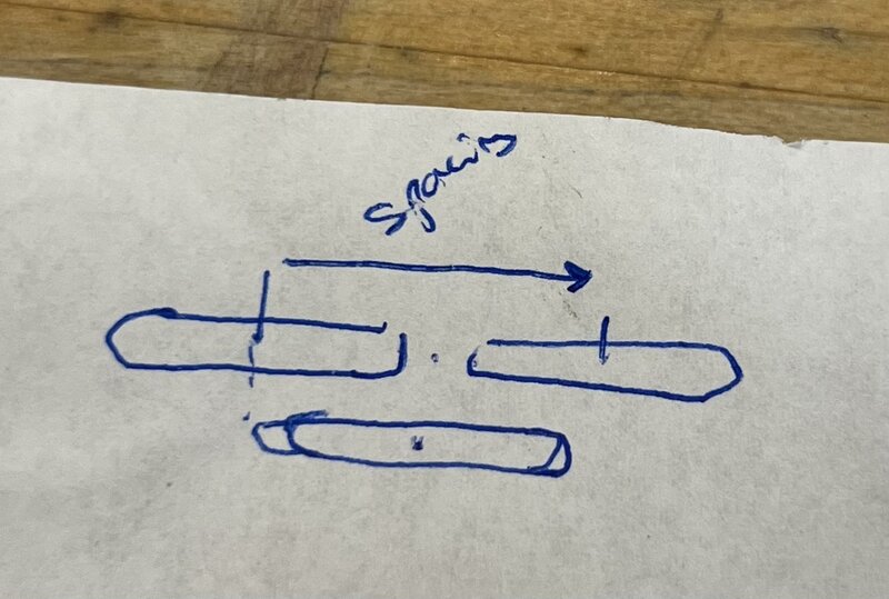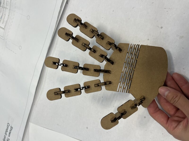 Next, I wanted to implement flexure across the palm. I was noodling with some online flexure patterns when Alfonso happened to walk by. He drew me a tiny drawing of the most fundamental flexure pattern, a grid of offset slots, and explained to me some of its more important properties (that the slots are positioned so there is a gap between them which is centered relative to the slot above it, that the spacing is sufficient to allow for this gap). He was even nice enough to draw it to scale, so I used approximate measurements from this very drawing to create my feature:
