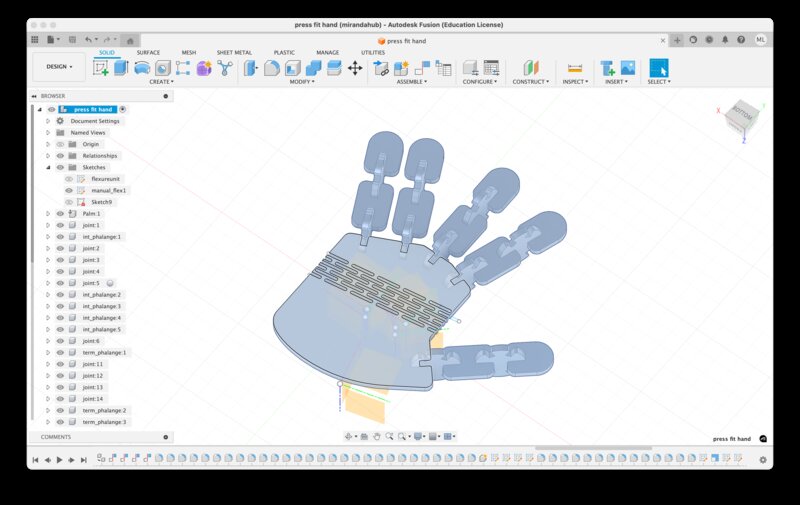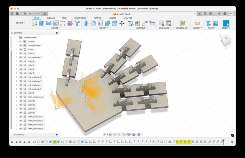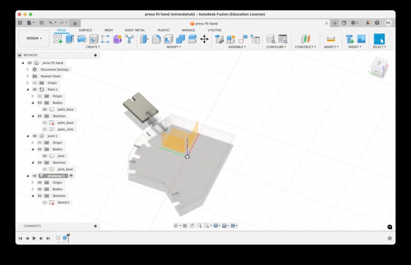 The terminal phalanges (with only one slot, e.g. the “fingertip”) were trivial to make, just a rectangle with one slot. In keeping with anatomical accuracy I made them slightly shorter than the intermediate phalanges. I then copy-pasted my components like crazy and used the Assemble functionality to put the pieces together. For each interface between a joint and a phalange I had to add three face-to-face constraints (one for each of X, Y, Z) to ensure the slots were fully slotted together.