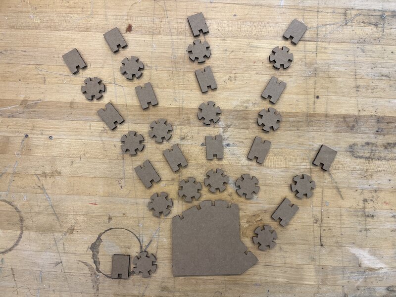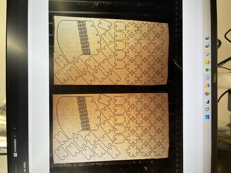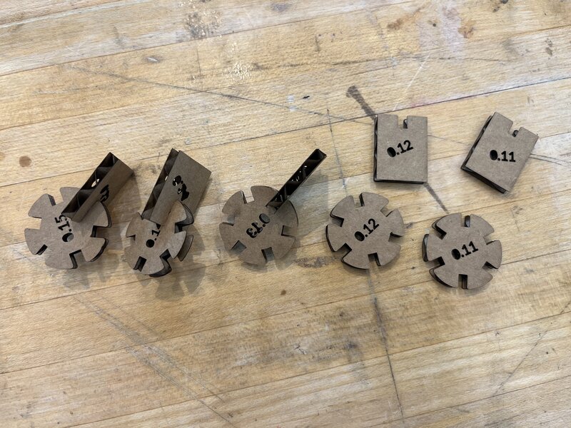 Mostly, everything looked good! I had a small hiccup where since my cardboard was bowed, though I had set the focus height of the laser to my measured material thickness, it still began to pull the cardboard piece around, so I had to stop the cut and manually quick-measure the highest point of the material, which ended up being more than twice the thickness of the material. Also, my joints were way too loose. I had measured my cardboard to be aroudn 0.16 inches thick so I’d set my cardboardThickness parameter to 0.16 inches in fusion, but everything was falling apart. So, I ran a small test to see what material thickness value would give me the joint clearance I was looking for: