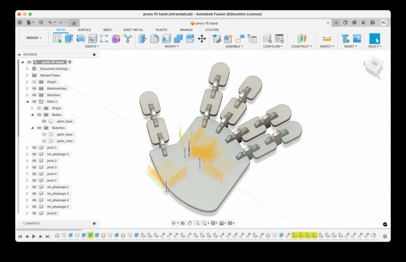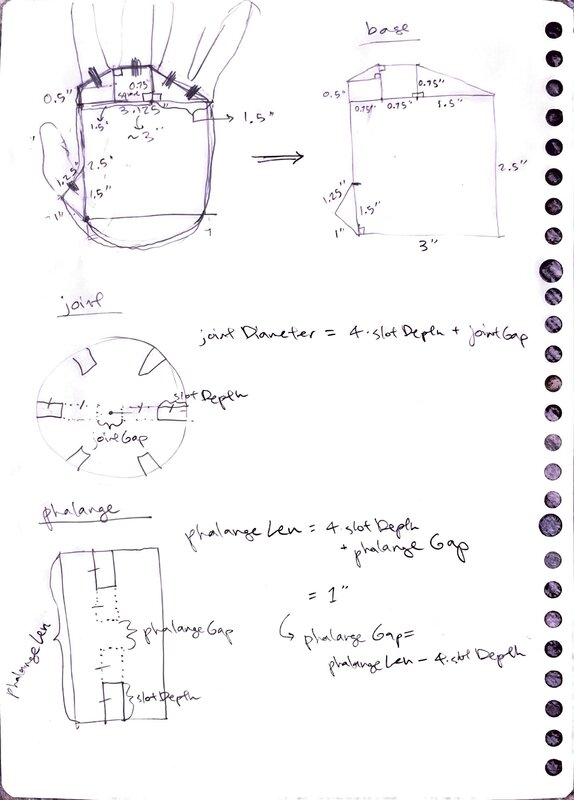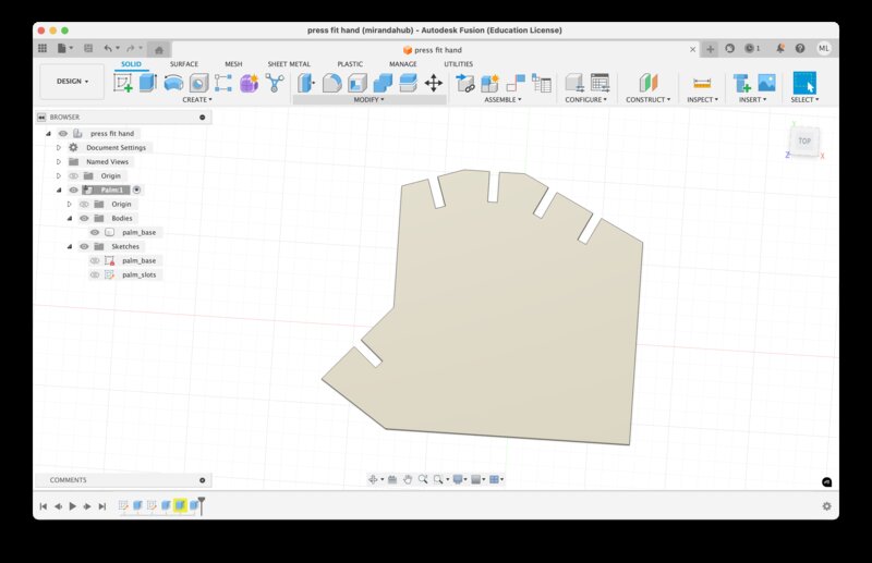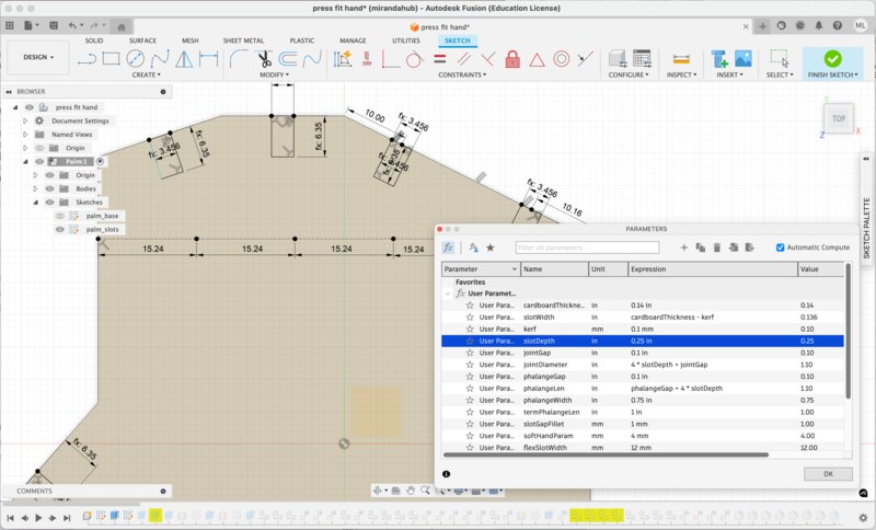 In another sketch, I parametrized the slot depth and width and used these to add slots to the extruded palm. I accounted for the kerf by subtracting the approximate kerf value from my initial (desired) slot width.