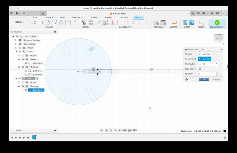 Next, I modelled the joint by similarly beginning with the very simple sketch I had made (in this case, a circle). I drew this sketch off of one of the inner faces of the slot in the palm to avoid having to assemble it later. Then I added one slot and used the circular pattern tool to make 6 evenly distributed slots around the circle.