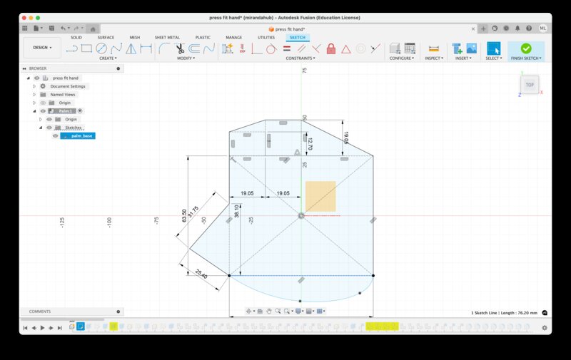 I implemented these into a sketch for the base palm (ignore the curve at the bottom, I added that later but forgot to take a screengrab at this point so I captured this after all was done).