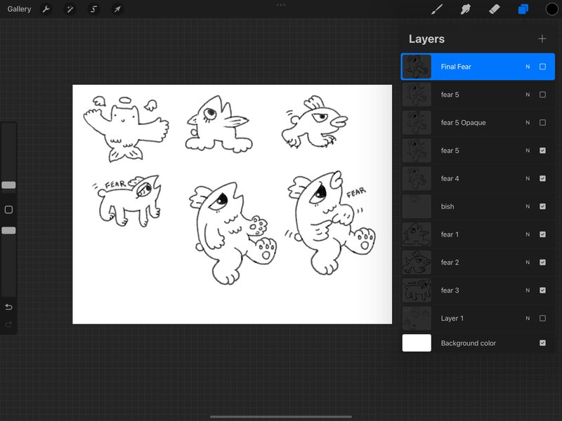 For this part of the assignment I wanted to take the opportunity to draw myself a laptop sticker. One motif that has been floating around my head recently is a “fear” – a fish-bear. I thought I would draw myself a fear for my laptop. Here are the sketches I made in Procreate: