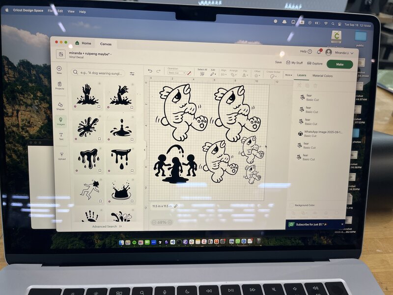 I was already in the CBA lab with Ruipeng, so we decided to layout our vinyl cut designs in the Cricut software together so that we could reduce vinyl waste. Here was our layout: