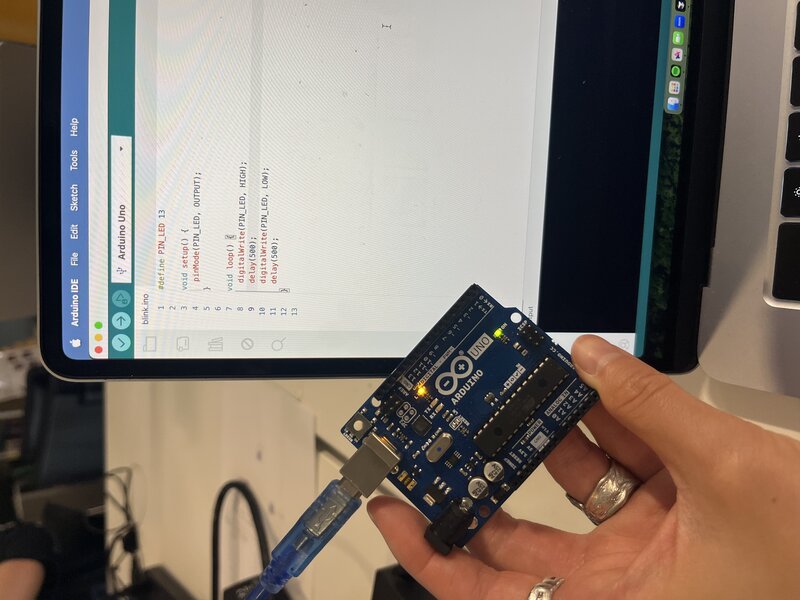 First, we tried using the Arduino IDE to send the code to an Arduino Uno. This was super easy and quick – we just had to plug in the Arduino, download the Arduino IDE, and copy-paste the .ino file into the IDE and press upload.