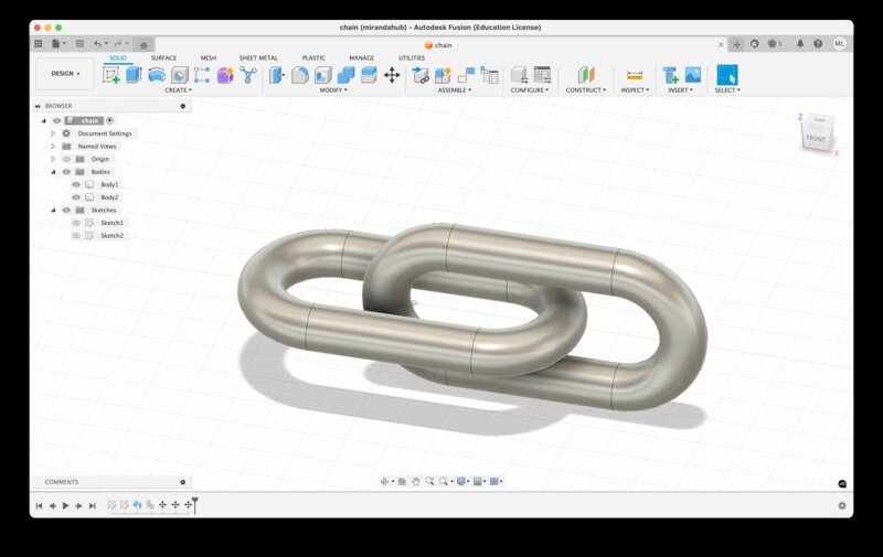 First, I designed two simple chain links in Fusion360. To do this, I made a sketch of a slot to get the general shape of the chain link. Then, I created a circle perpendicular to that path, and used the Sweep tool to sweep the circle around the path to produce a single link. I copy-pasted that link and arranged it so that it intersected the middle of the other link. Here was my final model in Fusion: