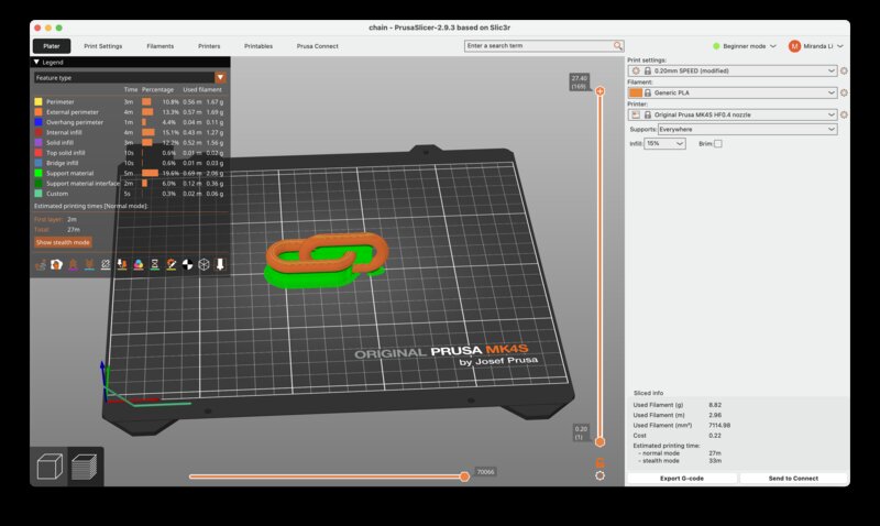 Next, I exported my .stl file and imported it into the Prusa slicer. After selecting my machine and configuring the materials and adding supports I was able to export a .bgcode file for printing.