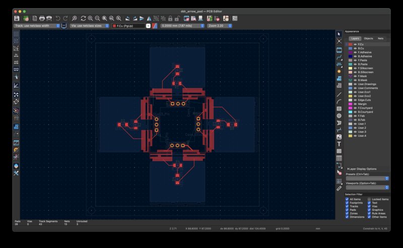 For my individual assignment I designed two PCBs to implement the arrow pad portion of my tiny DDR machine. I wanted to make it so that the pads don’t depress when pressed, but are still able to sense the pressure of a finger to register a dance move.