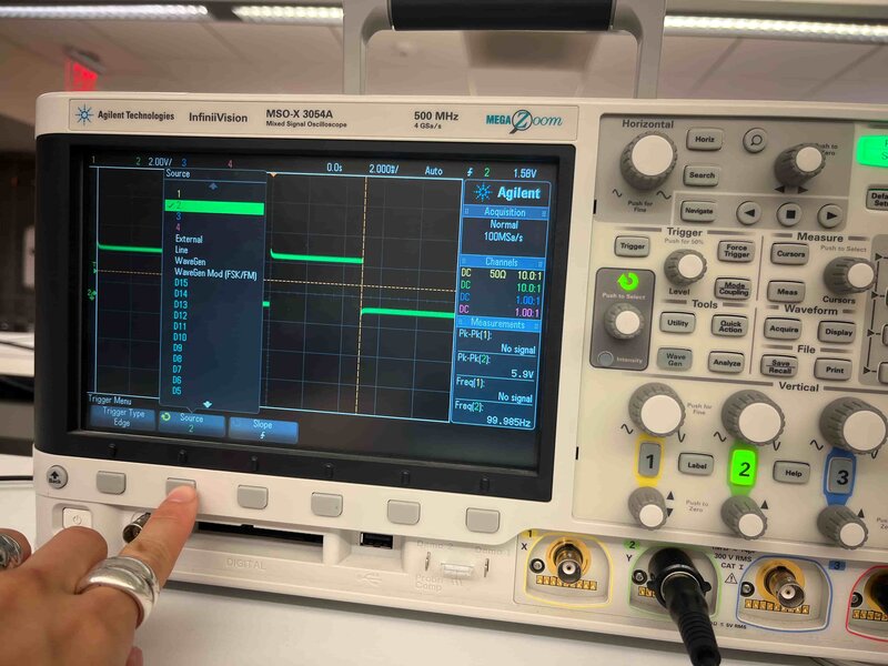 We then modified the blink sketch to blink one of the pins high and low, and used the oscilloscope to observe the signal. I touched the oscilloscope for the first time and it was a very cool experience and no one was injured.