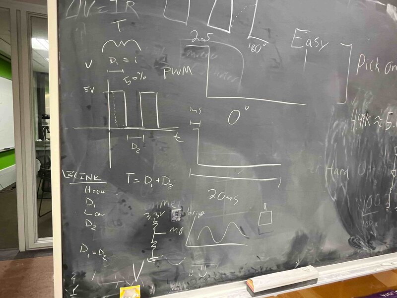 Quentin came around and uploaded code which gradually brightens and then dims the LED, and the signal on the oscilloscope was doing crazy rave visuals. In order to explain what was going on, Ben gave me a crash course on pulse width modulation (PWM).