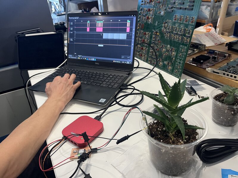 He showed me with the Saleae logic analyzer how a very simple I2C protocol he was running between a capacitive sensor for soil moisture dectection and a RP2040. I observed the three lines: clock, data, and ground. Ben explained that they do a sort of choreographed handshake and then dance in order to maintain the reliability of data transfer. First there is a SYN / ACK exchange to indicate that data is about to be sent. Then, the clock line pulses low / high while the data line sends bits. When the clock line returns to 1, there is no more data to be sent.