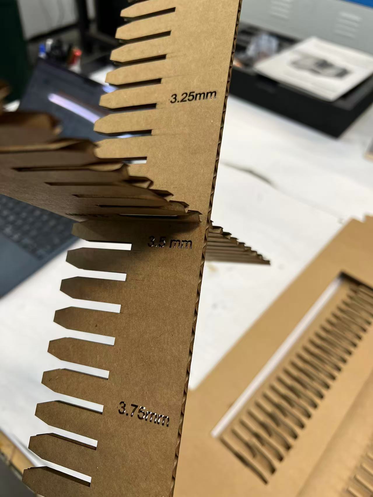 Before proceeding with the final design and laser cutting, we conducted kerf tests to determine the optimal joint tolerances for cardboard assembly. These tests involved cutting a series of slots with varying widths to identify which dimensions would allow two pieces of cardboard to fit together securely without being too loose or too tight. Through systematic testing, we discovered that a tolerance range of 3.25mm to 2.5mm provided the best friction fit, ensuring the pieces would interlock firmly while still being able to assemble without damaging the material.