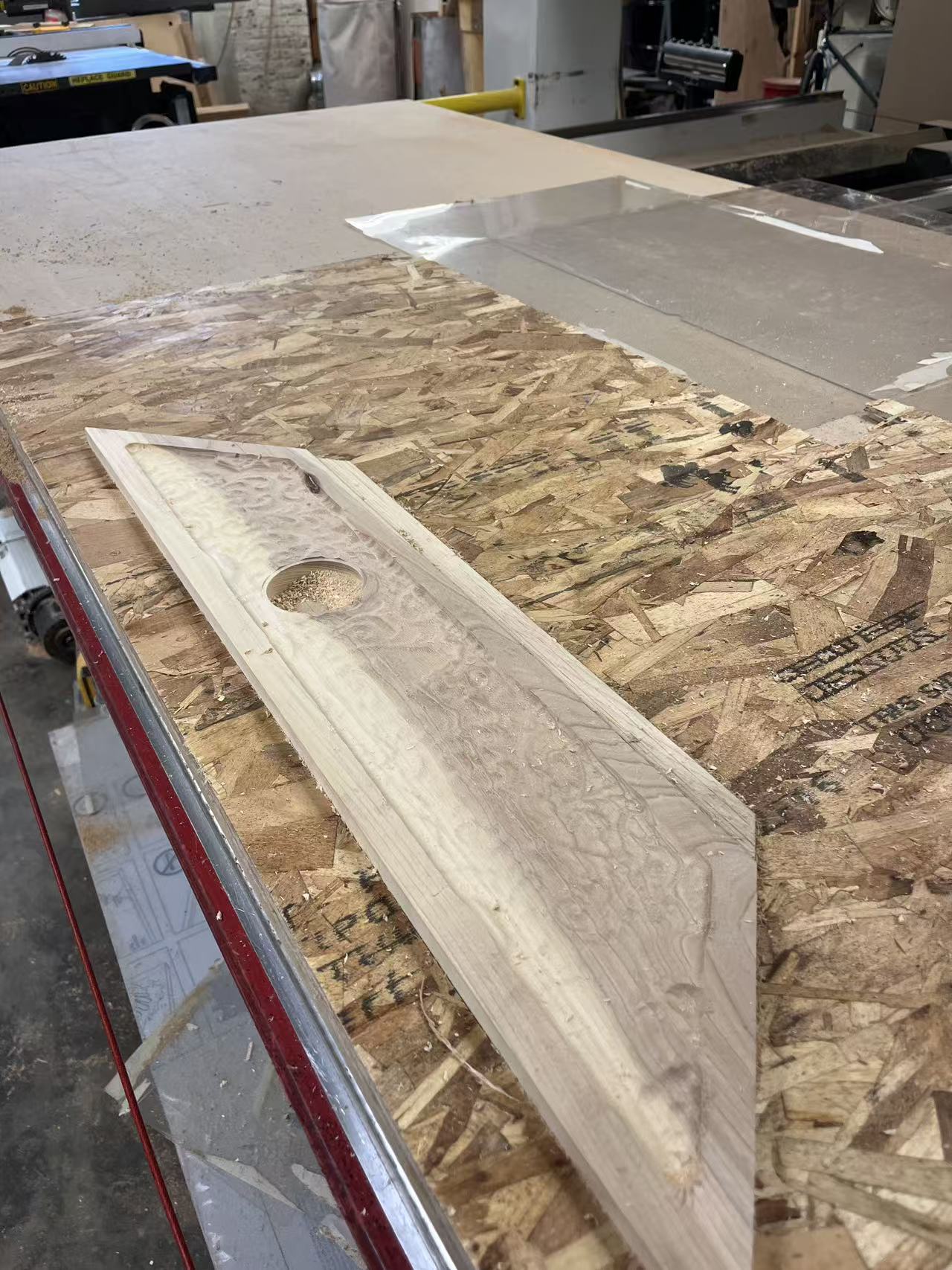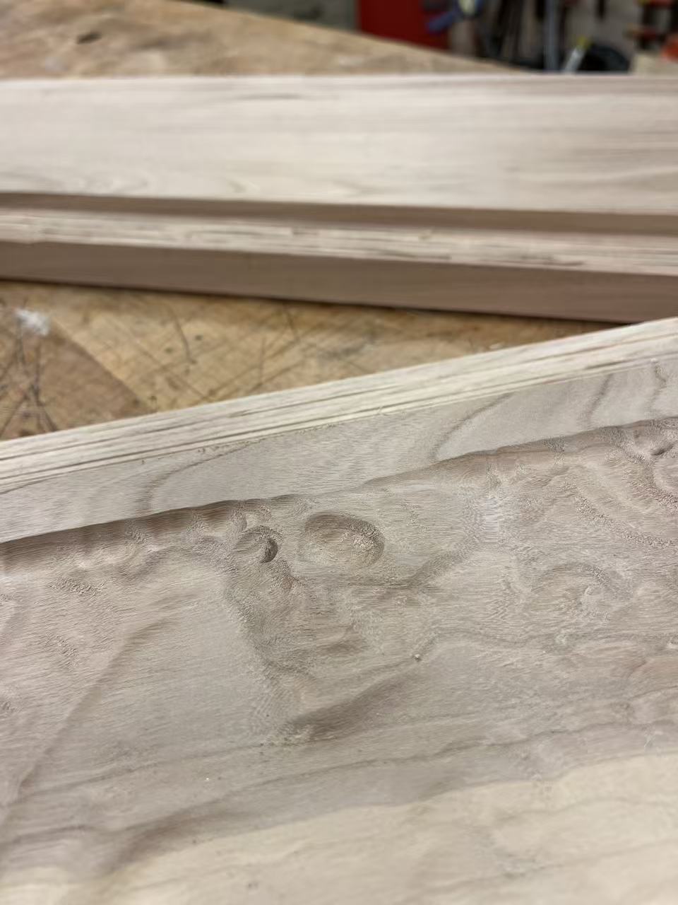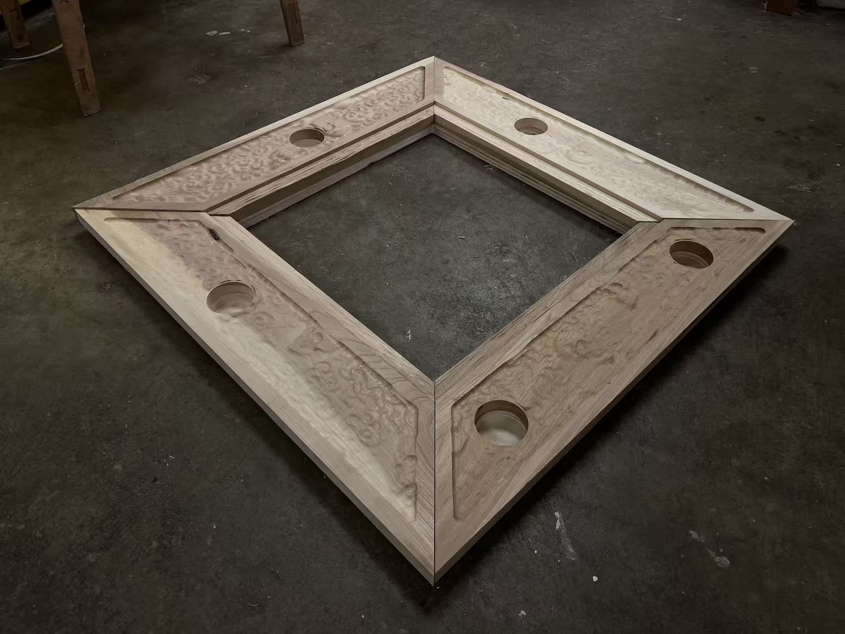 Once the patterns were finalized, we received the pre-cut wooden parts from the woodworking team. To ensure precise alignment during machining—and to avoid clamp marks—we built a custom tight-fitting CNC box fixture that held the pieces from the sides.