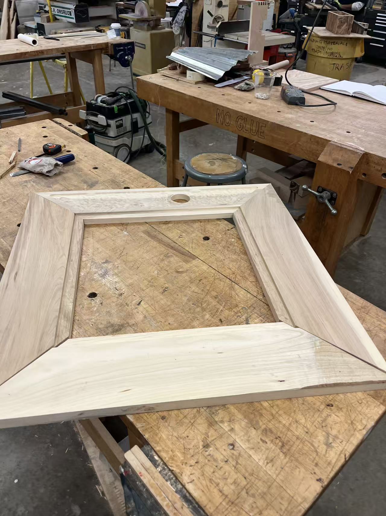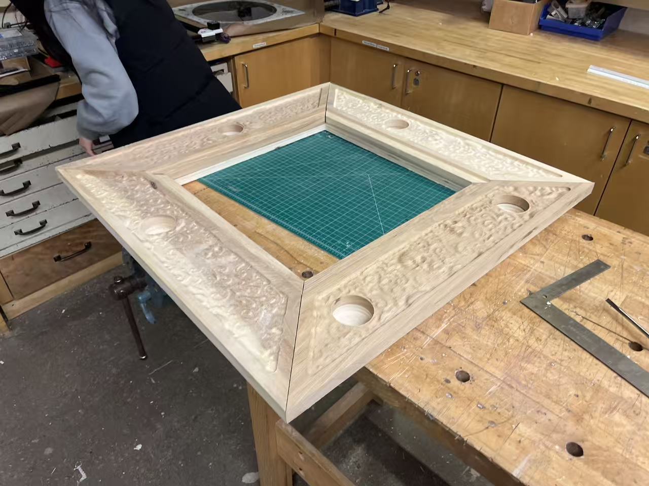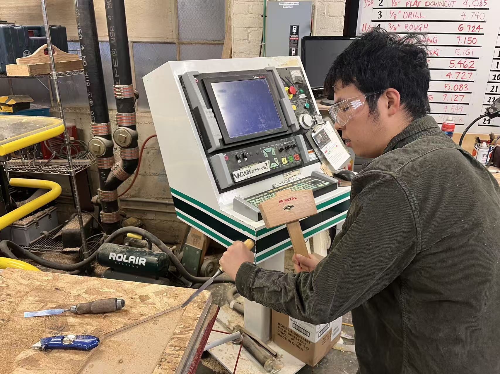 Once the patterns were finalized, we received the pre-cut wooden parts from the woodworking team. To ensure precise alignment during machining—and to avoid clamp marks—we built a custom tight-fitting CNC box fixture that held the pieces from the sides.