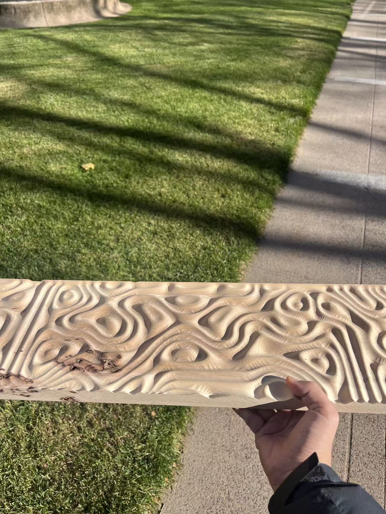 Working with Justin, we explored procedural patterns using Grasshopper. We tested curve density, line thickness, and spacing to create a refined yet mysterious texture. Several iterations were simulated to ensure good machinability with a ball-end mill.