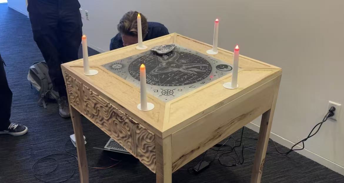 This week our group designed and built an automated haunted Ouija table. The goal was to make the planchette appear as if moved by an invisible force. Under the table, a CoreXY gantry carries a strong electromagnet. A magnet embedded inside the wooden planchette couples the two, allowing smooth and programmable movement across the engraved board. The full group documentation is here: Machine Week · Architecture Section .