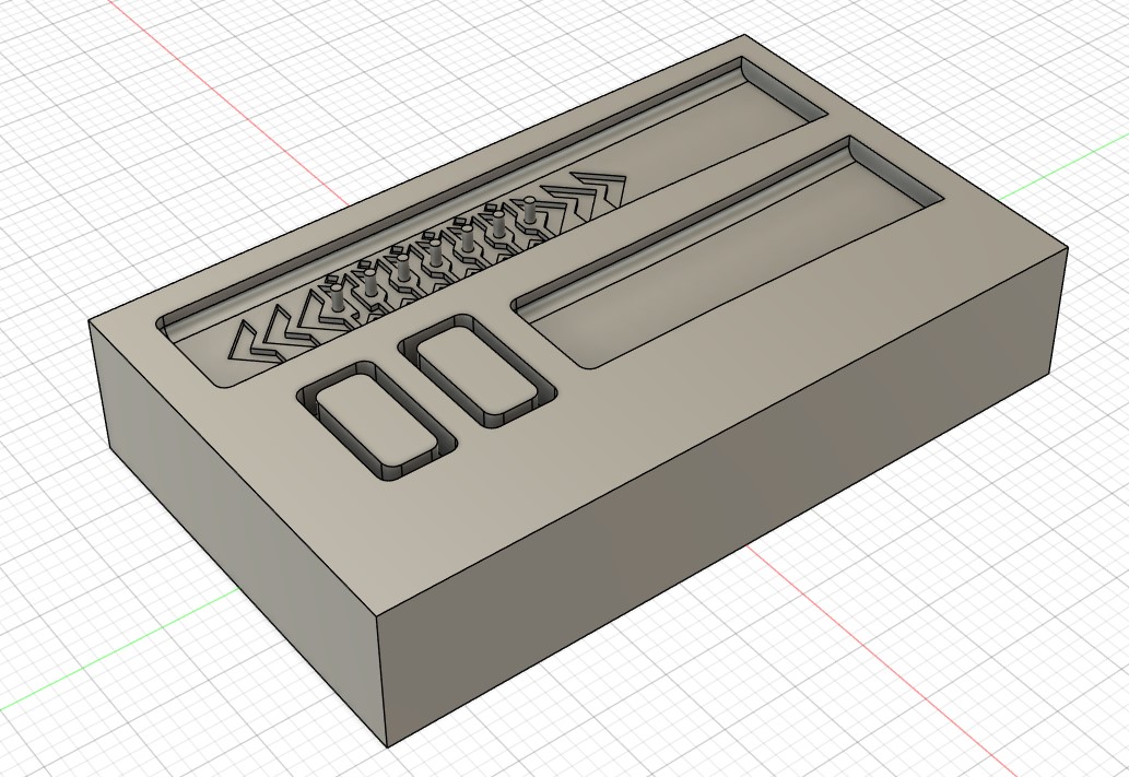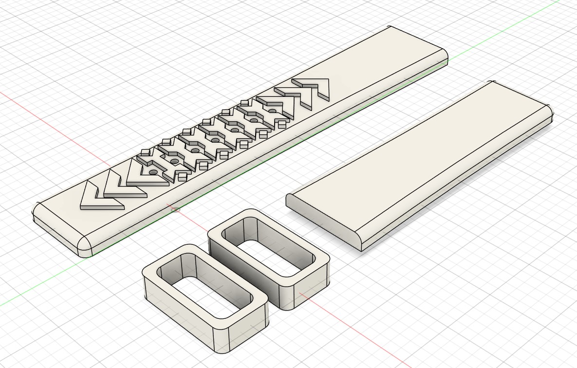 I was really excited for this week because I had no idea the wide variety of materials that can be easily cast in just simple wax or silicone molds. I was particularly interested in the drystone/hydrostone, although for now I did not use them for casting any parts. Instead, I decided that I was going to make a mold of a watch band which meant my casting material will be silicone. That essentially meant that I would make my mold out of the machinable wax, which I was on board with because I like CNC-ing things. I started with designing my parts, for which I used this site to make sure I had the proper dimensions for the band. There was no thickness specified, so I estimated that 4mm should be fine (although in hindsight this may have been just a bit too thick).I made all my parts face up, but I figured that when I mold them I would have them face down in the mold such that the patterns on the front would resolve and the back would be flat. I made three parts total, the longer band strap that has the holes for the buckle, the shorter band strap that would have the buckle, and a strap securing loop(?) that I would make two of. With all of these parts created, I loaded them into fusion, created a generic rectangle, aligned them to the top surface of the rectangle, and then intersect cut them away to create my mold.