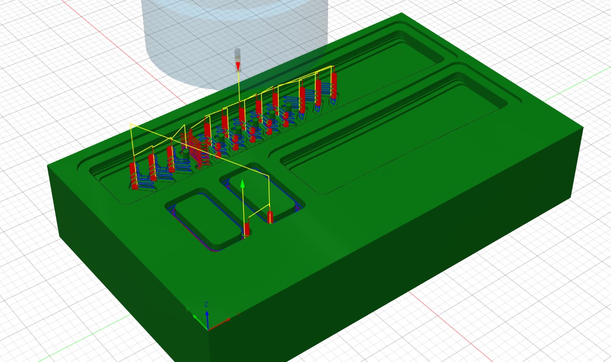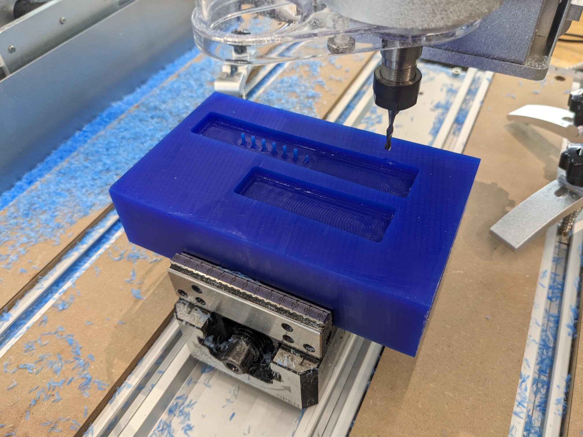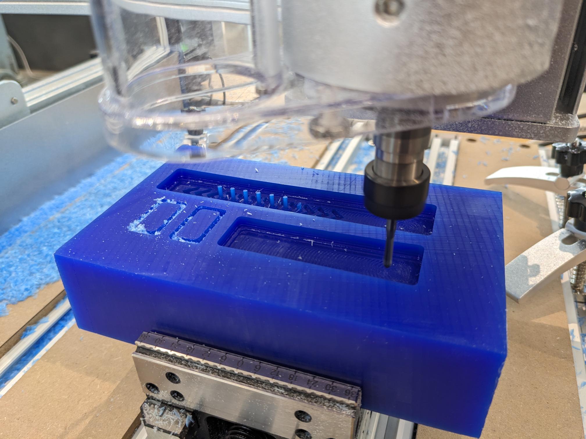 With my mold designed, I then set up my cut files for the CNC tool we were going to be using. I used a flat 1/8in end mill to do my first milling pass. This largely created the geometry of the two band sections. I then used a flat 1/16in end mill to cut the finer band patterns (I omitted the tiny squares because they did not come out well) as well as the two strap holders. The strap holders did not need any post processing with a ball end mill because they did not have any curved features to them which was nice. And finally, I went back over the band sections with a 1/8in ball end mill to create the fillets I had put in on the sides of the band. The software did add in a lot of additional passes on the 1/8in ball end mill, which I didn't really think was going to be a problem. I just couldn't figure out how to get a cut with the ball end mill to only cut the fillets and nothing else so I just had to let it go. For all of these cuts I left the spindle speed at 5000rpm and the default feed rate of 40in/min, except for the ball end mill finishing pass where I set the feed rate to 20in/min.