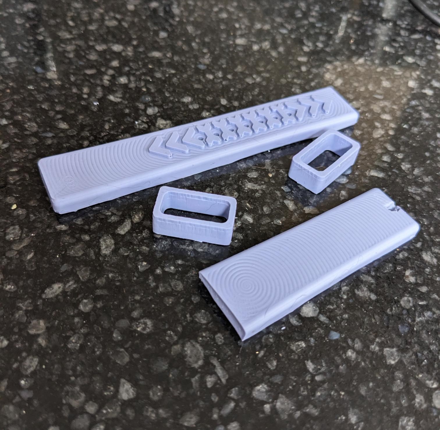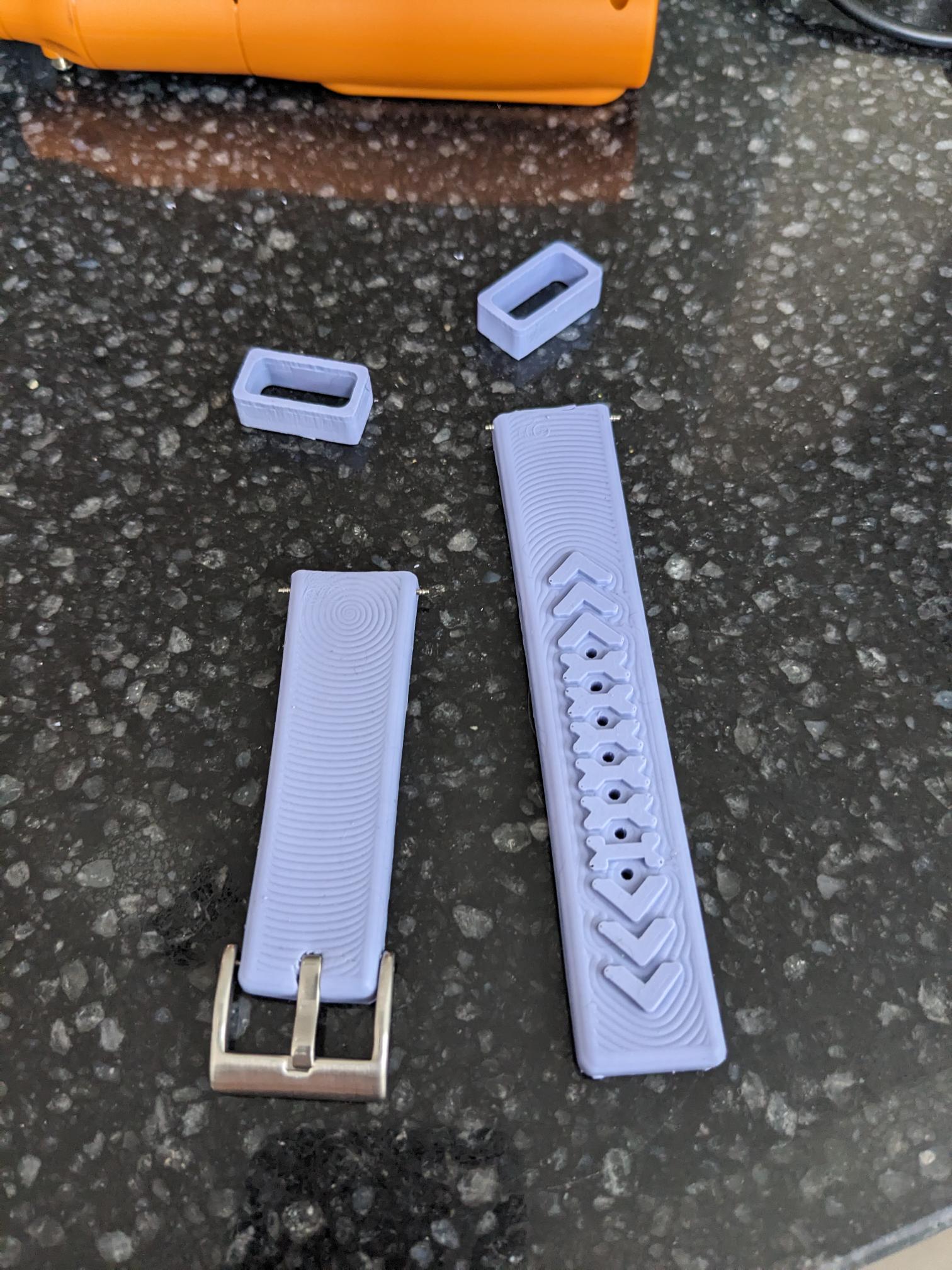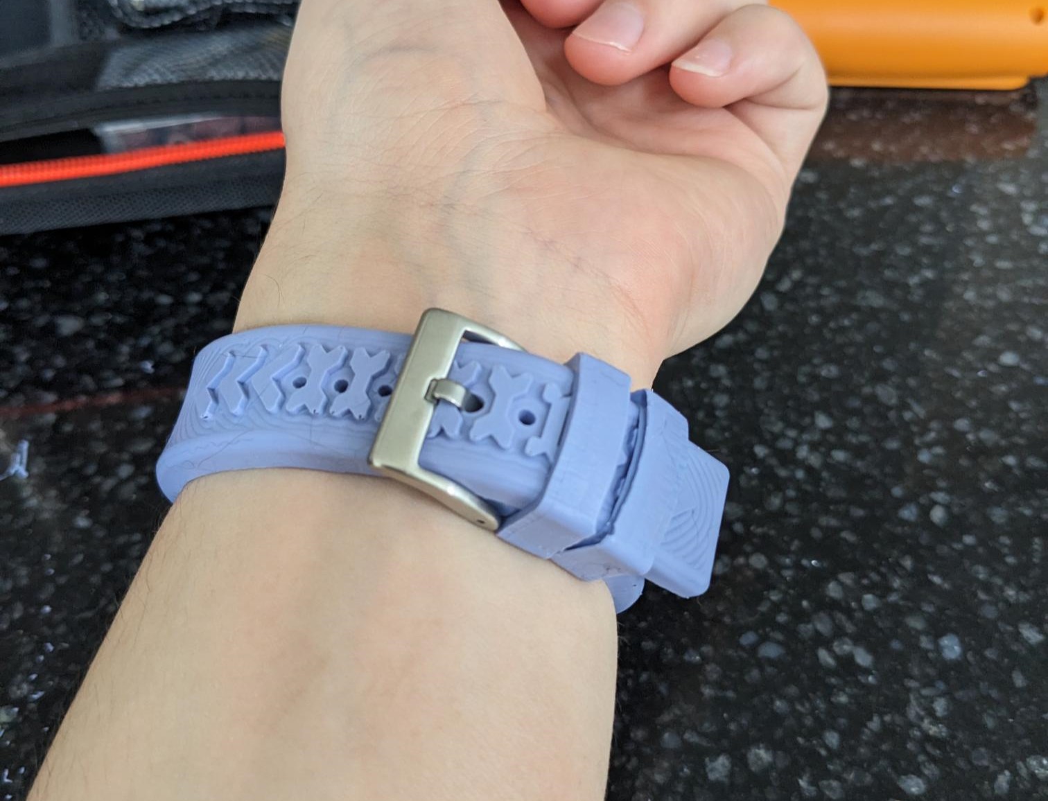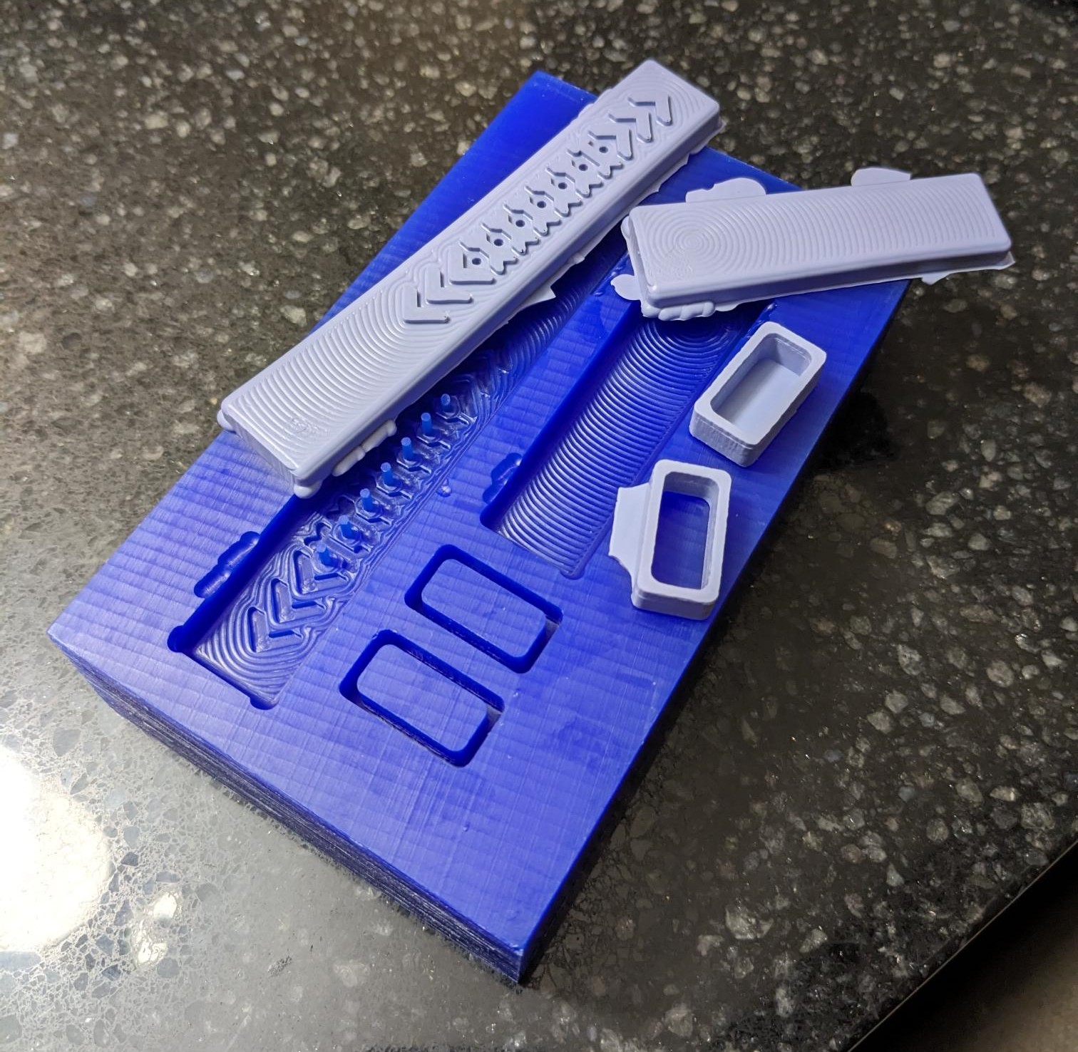 Part of me was still paranoid about the bubbles that would show, or the potential that for some reason it wasn't mixed well enough, but I am glad to say that those fears were mostly unfounded! After I picked up my mold, removing the parts was fairly easy even with the high aspect ratios of the band loops. There was a bunch of OOMOO that I had left on the surface, so I just trimmed the parts with some scissors and they cleaned up very nicely. As I had feared, the ball end mill passes were visible on the bands, but the passes again made kind of a cool pattern so I still think it looks pretty good. I did some additional post processing with a small electric dremel I have to open up the buckle holes and to allow spring bars to slot through, but the end result is a successful watch band which I was very proud of! Pending how the show and tell session goes, primarily feedback from Prof. Gershenfeld on the tool path visibility, we will see if I need to go back and make a new mold to try again...