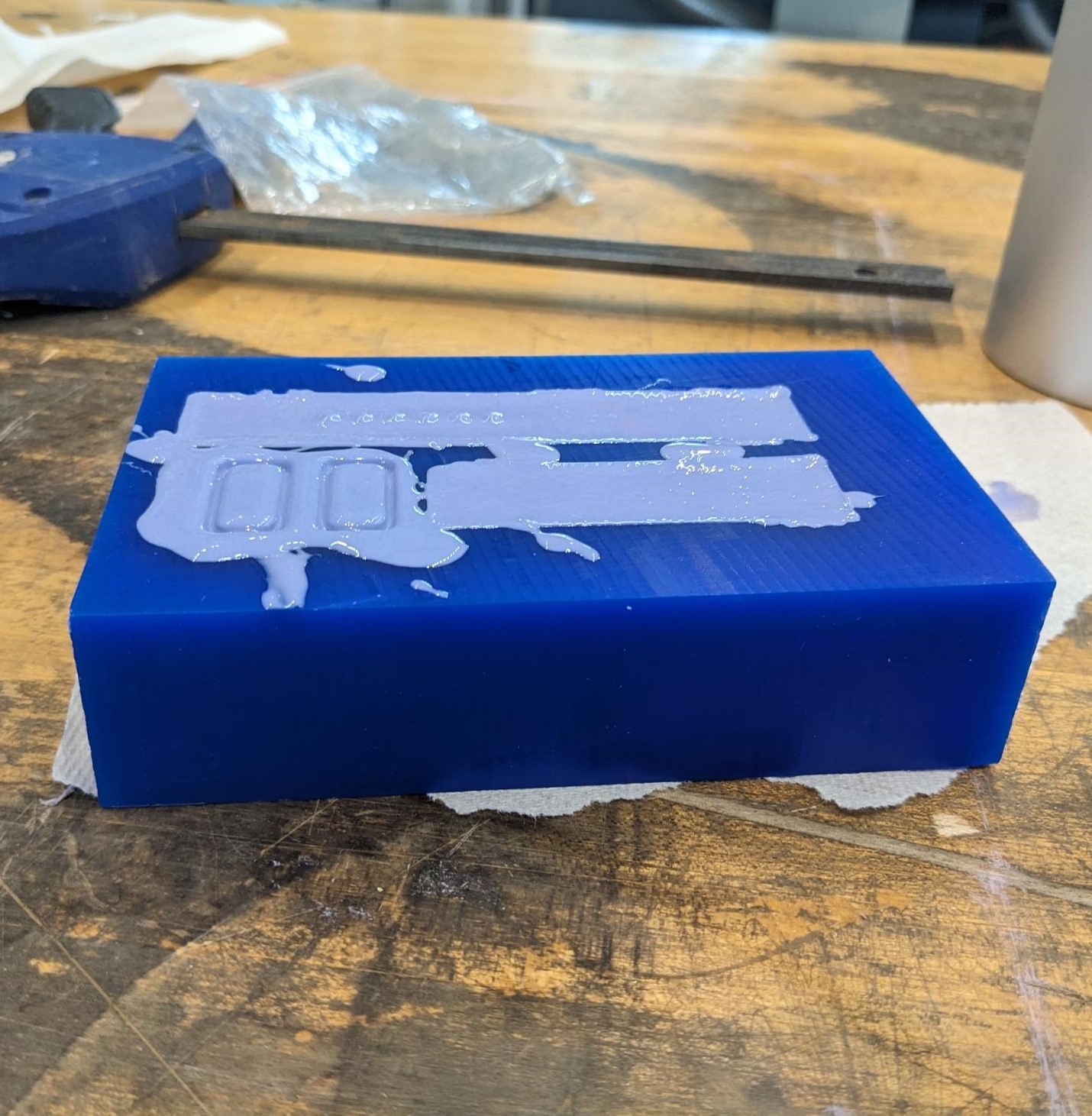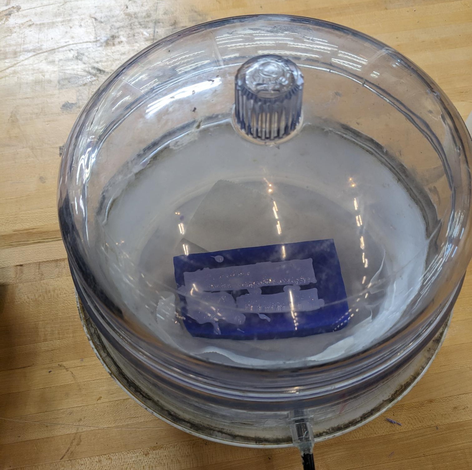 Regardless of the visible passes on the 'flat' portions of the mold, I moved on to the casting portion. I knew I was going to use silicone as mentioned earlier, so I ended up choosing OOMOO 30 as the material. For some reason I had a difficult time getting the two components to mix well together, and I was really trying to be careful to not cause air bubbles to form in the material, but sadly I noticed that a lot of air was getting in. When the silicone was mixed enough, I then ran into my second challenge, pouring without generating more air bubbles (especially into the high aspect ratio band loop things). At this point I kind of just accepted that there was a lot of air trapped in my material. So I smoothed out the top surface as much as I could, and tried to tap out a bunch of the bubbles. I then remembered that we have a small vacuum system that was set up for this very purpose, so I put my mold in and pulled a vacuum until the bubbles slowed significantly. At that point there was not much more I could do, so I left my mold to cure!